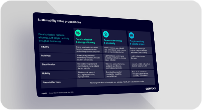 Sustainability value propositions Decarbonization, resource efficiency, and people centricity Decarbonization Resource efficiency People centricity through all businesses & energy efficiency & circularity & societal impact Industry Energy optimization and carbon Optimal resource and material Ergonomics and safety in footprint management across use, elimination of waste, reduced manufacturing and workflow product lifecycle and supply chain time to market and productivity optimization, product safety Buildings Building energy efficiency, Optimized asset performance, Healthy indoor climates, sustainability consulting, modular availability and lifetimes, building fire safety solutions and services space utilization Electrification Renewables integration and Optimized asset performance, Access to reliable and resilient electrification in real and digital availability and lifetimes, electricity, electrical safety domain, eMobility electrical asset protection Mobility Efficient public transport, Extended lifecycles from Data-driven services for e.g., high-speed, battery, repairability, reusability, increased system capacity, hydrogen trains or refurbishment availability, and reliability Financial Services Financing new clean technologies, new business models, and sustainable innovation Page 21 Unrestricted | © Siemens 2024 | May 2024