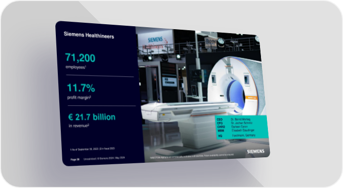 Siemens Healthineers 71,200 employees1 11.7% profit margin2 € 21.7 billion CEO Dr. Bernd Montag in revenue2 CFO Dr. Jochen Schmitz CHRO Darleen Caron MBM Elisabeth Staudinger HQ Forchheim, Germany 1As of September 30, 2023 | 2 In fiscal 2023 Page 38 Unrestricted | © Siemens 2024 | May 2024 NAEOTOM Alpha is not commercially available in all countries. Future availability cannot be ensured.