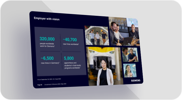 Employer with vision 320,000 ~40,700 people worldwide newhiresworldwide2 work for Siemens1 ~6,500 5,800 2 newhiresin Germany apprentices and students in dual-study programs worldwide1 1As of September 30, 2023 | 2 In fiscal 2023 Page 52 Unrestricted | © Siemens 2024 | May 2024