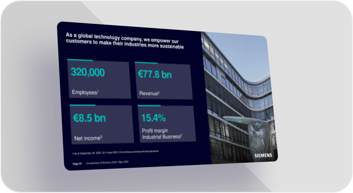 As a global technology company, we empower our customers to make their industries more sustainable 320,000 €77.8 bn Employees1 Revenue2 €8.5 bn 15.4% Profit margin Net income3 Industrial Business2 1As of September 30, 2023 | 2 In fiscal 2023 |3 Continuing and discontinued operations Page 24 Unrestricted | © Siemens 2024 | May 2024