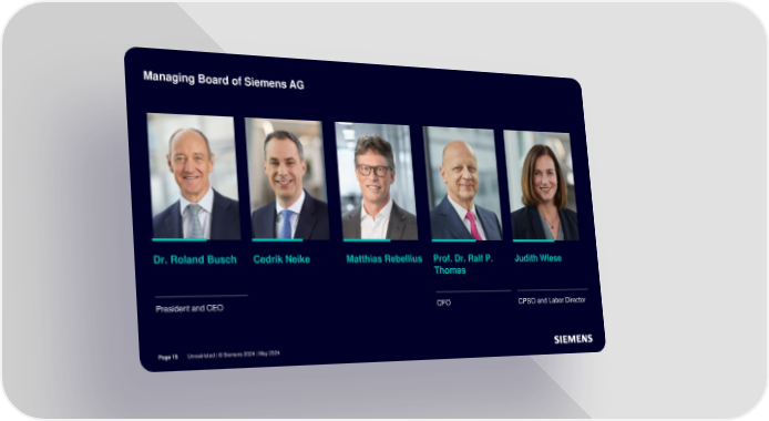 Company presentation Page 14 Page 16Managing Board of Siemens AG Dr. Roland Busch Cedrik Neike Matthias Rebellius Prof. Dr. Ralf P. Judith Wiese Thomas President and CEO CFO CPSO and Labor Director Page 15 Unrestricted | © Siemens 2024 | May 2024