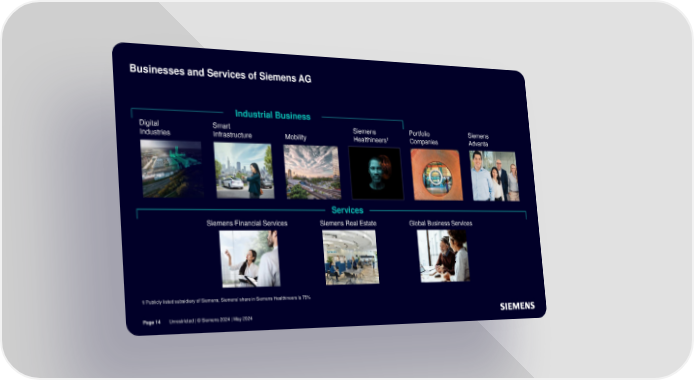 Businesses and Services of Siemens AG Industrial Business Digital Smart Siemens Portfolio Siemens 1 Industries Infrastructure Mobility Healthineers Companies Advanta Services Siemens Financial Services Siemens Real Estate Global Business Services 1Publicly listed subsidiary of Siemens; Siemens’ share in Siemens Healthineers is 75% Page 14 Unrestricted | © Siemens 2024 | May 2024