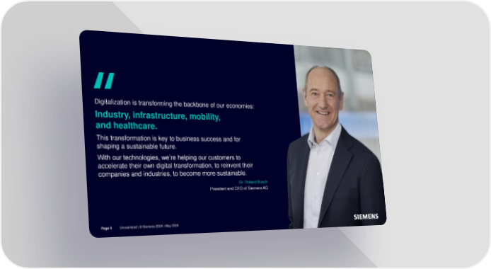 Quote from Dr. Roland Busch, Chairman of Siemens AG, on the corporate strategy of Siemens AG Digitalization is transforming the backbone of our economies: Industry, infrastructure, mobility, and healthcare. This transformation is key to business success and for shaping a sustainable future. With our technologies, we’re helping our customers to accelerate their own digital transformation, to reinvent their companies and industries, to become more sustainable. Dr. Roland Busch President and CEO of Siemens AG Page 4 Unrestricted | © Siemens 2024 | May 2024
