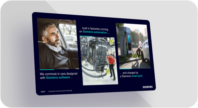 Examples from Siemens AG from industry … built in factories running on Siemens automation ... We commute in cars designed … and charged by with Siemens software … a Siemens smart grid. Page 8 Unrestricted | © Siemens 2024 | May 2024