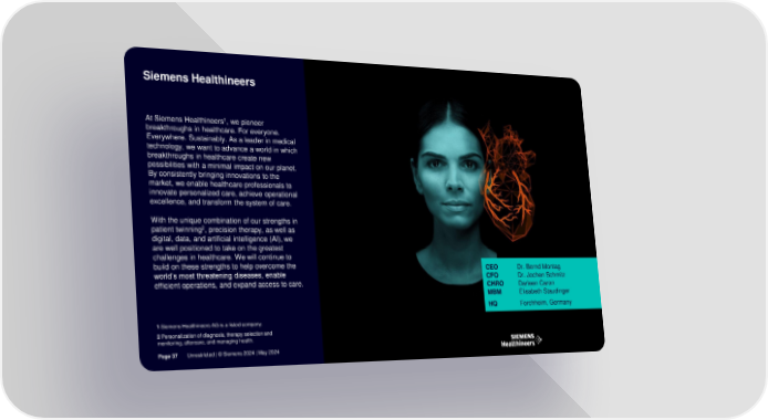 Siemens Healthineers 1 At Siemens Healthineers , we pioneer breakthroughs in healthcare. For everyone. Everywhere. Sustainably. As a leader in medical technology, we want to advance a world in which breakthroughs in healthcare create new possibilities with a minimal impact on our planet. By consistently bringing innovations to the market, we enable healthcare professionals to innovate personalized care, achieve operational excellence, and transform the system of care. With the unique combination of our strengths in 2 patient twinning , precision therapy, as well as digital, data, and artificial intelligence (AI), we are well positioned to take on the greatest challenges in healthcare. We will continue to build on these strengths to help overcome the CEO Dr. Bernd Montag world’s most threatening diseases, enable CFO Dr. Jochen Schmitz efficient operations, and expand access to care. CHRO Darleen Caron MBM Elisabeth Staudinger HQ Forchheim, Germany 1 Siemens Healthineers AG is a listed company. 2 Personalization of diagnosis, therapy selection and monitoring, aftercare, and managing health. Page 37 Unrestricted | © Siemens 2024 | May 2024