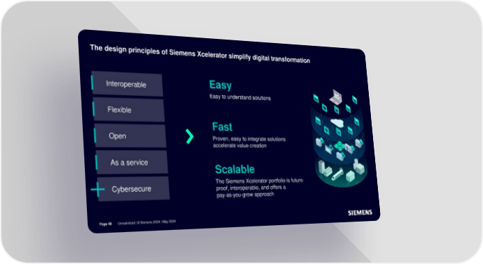 The design principles of Siemens Xcelerator simplify digital transformation Interoperable Easy Easy to understand solutions Flexible Fast Open Proven, easy to integrate solutions accelerate value creation As a service Scalable Cybersecure The Siemens Xcelerator portfolio is future- proof, interoperable, and offers a pay-as-you-grow approach Page 48 Unrestricted | © Siemens 2024 | May 2024