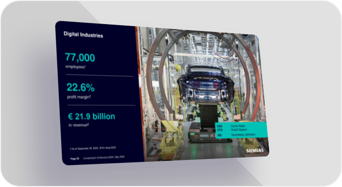 Digital Industries 77,000 employees1 22.6% profit margin2 € 21.9 billion in revenue2 CEO Cedrik Neike CFO Rudolf Basson HQ Nuremberg, Germany 1As of September 30, 2023 | 2 For fiscal 2023 Page 32 Unrestricted | © Siemens 2024 | May 2024