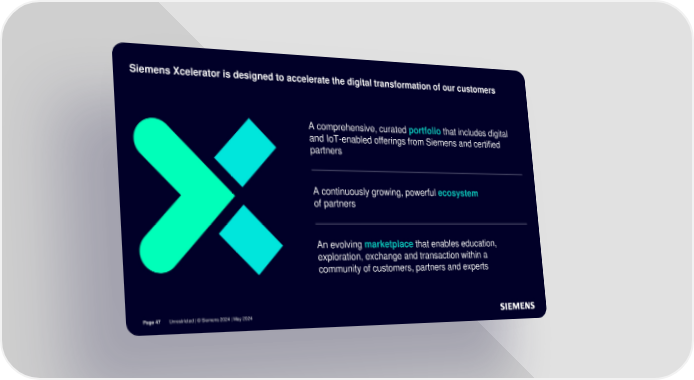 Siemens Xcelerator is designed to accelerate the digital transformation of our customers A comprehensive, curated portfolio that includes digital and IoT-enabled offerings from Siemens and certified partners A continuously growing, powerful ecosystem of partners An evolving marketplace that enables education, exploration, exchange and transaction within a community of customers, partners and experts Page 47 Unrestricted | © Siemens 2024 | May 2024