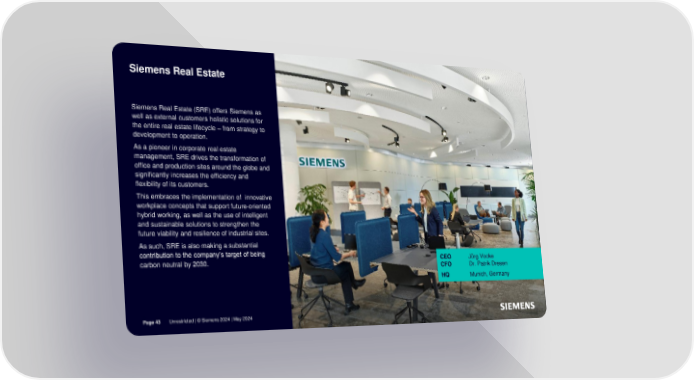 Siemens Real Estate Siemens Real Estate (SRE) offers Siemens as well as external customers holistic solutions for the entire real estate lifecycle – from strategy to development to operation. As a pioneer in corporate real estate management, SRE drives the transformation of office and production sites around the globe and significantly increases the efficiency and flexibility of its customers. This embraces the implementation of innovative workplace concepts that support future-oriented hybrid working, as well as the use of intelligent and sustainable solutions to strengthen the future viability and resilience of industrial sites. As such, SRE is also making a substantial contribution to the company’s target of being CEO Jörg Vocke carbon neutral by 2030. CFO Dr. Patrik Dresen HQ Munich, Germany Page 43 Unrestricted | © Siemens 2024 | May 2024