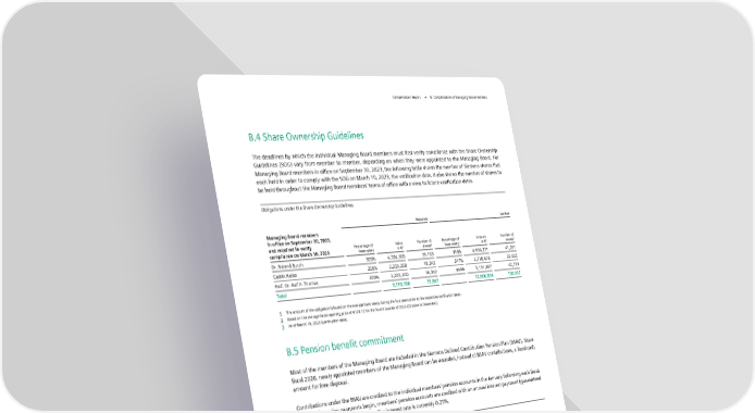 Compensation Report → B. Compensation of Managing Board members B.4 Share Ownership Guidelines The deadlines by which the individual Managing Board members must first verify compliance with the Share Ownership Guidelines (SOG) vary from member to member, depending on when they were appointed to the Managing Board. For Managing Board members in office on September 30, 2023, the following table shows the number of Siemens shares that each held in order to comply with the SOG on March 10, 2023, the verification date. It also shows the number of shares to be held throughout the Managing Board members’ terms of office with a view to future verification dates. Obligations under the Share Ownership Guidelines Required Verified Managing Board members in office on September 30, 2023, and required to verify Percentage of Value Number of Percentage of Amount Number of compliance on March 10, 2023 1 2 1 2 3 base salary in € shares base salary in € shares Dr. Roland Busch 300% 4,704,300 39,163 316% 4,956,271 41,261 Cedrik Neike 200% 2,203,200 18,342 247% 2,718,676 22,633 Prof. Dr. Ralf P. Thomas 200% 2,203,200 18,342 466% 5,131,887 42,723 Total 9,110,700 75,847 12,806,834 106,617 1 The amount of the obligation is based on the average base salary during the four years prior to the respective verification dates. 2 Based on the average Xetra opening price of €120.12 for the fourth quarter of 2022 (October to December). 3 As of March 10, 2023 (verification date). B.5 Pension benefit commitment Most of the members of the Managing Board are included in the Siemens Defined Contribution Pension Plan (BSAV). Since fiscal 2020, newly appointed members of the Managing Board can be awarded, instead of BSAV contributions, a fixed cash amount for free disposal. Contributions under the BSAV are credited to the individual members’ pension accounts in the January following each fiscal year. Until pension payments begin, members’ pension accounts are credited with an annual interest payment (guaranteed interest) on January 1 of each year. The interest rate is currently 0.25%. Information regarding the Siemens Defined Contribution Pension Plan (BSAV) Defined benefit obligation for all pension commitments 1 2 Contributions Service costs according to IAS 19R excluding deferred compensation (Amounts in €) 2023 2022 2023 2022 2023 2022 Managing Board members in office on September 30, 2023 Dr. Roland Busch 991,200 991,200 792,442 913,079 8,569,123 7,814,364 Cedrik Neike 616,896 616,896 502,591 581,069 4,350,198 4,026,008 Prof. Dr. Ralf P. Thomas 616,896 616,896 518,342 578,296 8,707,501 7,572,833 Total 2,224,992 2,224,992 1,813,375 2,072,444 21,626,822 19,413,205 1 A total of €12,325 is attributable to the funding of personal pension benefit commitments earned prior to the transfer to the BSAV. 2 Deferred compensation for Prof. Dr. Ralf P. Thomas totals €59,980 (2022: €57,419). Judith Wiese and Matthias Rebellius, who were appointed to the Managing Board as of October 1, 2020, are not included in the BSAV. Instead of BSAV contributions, the Supervisory Board awarded these members for fiscal 2023 a fixed cash amount of €550,800 each for free disposal. This amount will be paid in January 2024. FISCAL 2023 26