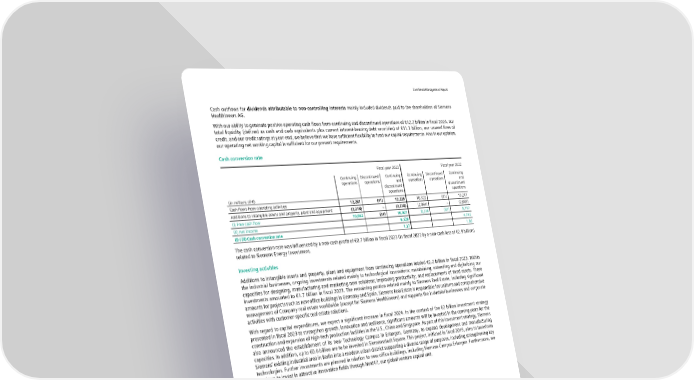 Combined Management Report Cash outflows for dividends attributable to non-controlling interests mainly included dividends paid to the shareholders of Siemens Healthineers AG. With our ability to generate positive operating cash flows from continuing and discontinued operations of €12.2 billion in fiscal 2023, our total liquidity (defined as cash and cash equivalents plus current interest-bearing debt securities) of €11.1 billion, our unused lines of credit, and our credit ratings at year-end, we believe that we have sufficient flexibility to fund our capital requirements. Also in our opinion, our operating net working capital is sufficient for our present requirements. Cash conversion rate Fiscal year 2023 Fiscal year 2022 Continuing Discontinued Continuing Continuing Discontinued Continuing operations operations and operations operations and discontinued discontinued (in millions of €) operations operations Cash flows from operating activities 12,281 (41) 12,239 10,322 (81) 10,241 Additions to intangible assets and property, plant and equipment (2,218) − (2,218) (2,084) − (2,083) (I) Free cash flow 10,062 (41) 10,021 8,238 (81) 8,157 (II) Net income 8,529 4,392 (I) / (II) Cash conversion rate 1.17 1.86 The cash conversion rate was influenced by a non-cash profit of €0.7 billion in fiscal 2023 (in fiscal 2022 by a non-cash loss of €2.9 billion) related to Siemens Energy Investment. Investing activities Additions to intangible assets and property, plant and equipment from continuing operations totaled €2.2 billion in fiscal 2023. Within the industrial businesses, ongoing investments related mainly to technological innovations; maintaining, extending and digitalizing our capacities for designing, manufacturing and marketing new solutions; improving productivity; and replacements of fixed assets. These investments amounted to €1.7 billion in fiscal 2023. The remaining portion related mainly to Siemens Real Estate, including significant amounts for projects such as new office buildings in Germany and Spain. Siemens Real Estate is responsible for uniform and comprehensive management of Company real estate worldwide (except for Siemens Healthineers) and supports the industrial businesses and corporate activities with customer-specific real estate solutions. With regard to capital expenditures, we expect a significant increase in fiscal 2024. In the context of the €2 billion investment strategy presented in fiscal 2023 to strengthen growth, innovation and resilience, significant amounts will be invested in the coming years for the construction and expansion of high-tech production facilities in the U.S., China and Singapore. As part of this investment strategy, Siemens also announced the establishment of its new Technology Campus in Erlangen, Germany, to expand development and manufacturing capacities. In addition, up to €0.6 billion are to be invested in Siemensstadt Square. This project, initiated in fiscal 2019, aims to transform Siemens’ existing industrial area in Berlin into a modern urban district supporting a diverse range of purposes, including strengthening key technologies. Further investments are planned in relation to new office buildings, including Siemens Campus Erlangen. Furthermore, we continue to invest in attractive innovation fields through Next47, our global venture capital unit. 19