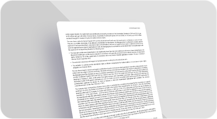 Combined Management Report and/or warrant bonds, the capital stock was conditionally increased by resolutions of the Shareholders’ Meetings in 2019 and 2020, by up to 80 million and up to 60 million Siemens shares, respectively (Conditional Capitals 2019 and 2020), i.e. in total by up to €420 million nominal through the issuance of up to 140 million Siemens shares. The new shares under Authorized Capital 2019 and the aforementioned bonds are to be issued against contributions in cash or in kind. They are, as a matter of principle, to be offered to shareholders for subscription. The Managing Board is authorized to exclude, with the approval of the Supervisory Board, subscription rights of shareholders in the event of capital increases against contributions in kind. In the event of capital increases against contributions in cash, the Managing Board is authorized to exclude shareholders’ subscription rights with the approval of the Supervisory Board in the following cases: • The issue price of the new shares/bonds is not significantly lower than the stock market price of Siemens shares already listed or the theoretical market price of the bonds computed in accordance with generally accepted actuarial methods (exclusion of subscription rights, limited to 10% of the capital stock, in accordance with or by mutatis mutandis application of Section 186 para. 3 sentence 4 German Stock Corporation Act). • The exclusion is necessary with regard to fractional amounts resulting from the subscription ratio. • The exclusion is used to provide subscription rights as dilution compensation for holders/creditors of conversion or option rights/ obligations on Siemens shares. The new shares issued or to be issued against contributions in cash or in kind, and with shareholders’ subscription rights excluded, may in certain cases be subject to further restrictions. The details of those restrictions are described in the respective authorizations. In addition, the Managing Board has declared, by way of a voluntary commitment, not to increase the capital stock from the Authorized Capital 2019 and the Conditional Capitals 2019 and 2020 by a total of more than 10% of the capital stock existing at the time of the Shareholders’ Meeting on February 5, 2020, to the extent that capital increases with shareholders’ subscription rights excluded are made from the Authorized Capital 2019 against contributions in cash or in kind or to service convertible bonds and/or warrant bonds issued under the authorizations approved on January 30, 2019 or February 5, 2020 with shareholders’ subscription rights excluded. This voluntary commitment ends no later than February 4, 2025. The Company may not repurchase Siemens shares unless so authorized by a resolution duly adopted by the shareholders at a general meeting or in other very limited circumstances set forth in the German Stock Corporation Act. On February 5, 2020, the Shareholders’ Meeting authorized the Company to acquire until February 4, 2025 up to 10% of its capital stock existing at the date of adopting the resolution or – if the value is lower – as of the date on which the authorization is exercised. The aggregate of shares of stock of Siemens AG repurchased under this authorization and any other Siemens shares previously acquired and still held in treasury by the Company or attributable to the Company pursuant to Sections 71d and 71e of the German Stock Corporation Act may at no time exceed 10% of the then existing capital stock. Any repurchase of Siemens shares shall be accomplished at the discretion of the Managing Board either (1) by acquisition over the stock exchange, (2) through a public share repurchase offer or (3) through a public offer to swap Siemens shares for shares in a listed company within the meaning of Section 3 para. 2 German Stock Corporation Act. The Managing Board is additionally authorized to complete the repurchase of Siemens shares in accordance with the authorization described above by using certain derivatives (put and call options, forward purchases and any combination of these derivatives). In exercising this authorization, all stock repurchases based on the derivatives are limited to a maximum volume of 5% of Siemens' capital stock existing at the date of adopting the resolution at the Shareholders’ Meeting. A derivative’s term of maturity may not, in any case, exceed 18 months and must be chosen in such a way that the repurchase of Siemens shares upon exercise of the derivative will take place no later than February 4, 2025. In addition to selling over the stock exchange or through a public sales offer to all shareholders, the Managing Board is authorized by resolution of the Shareholders’ Meeting on February 5, 2020 to also use Siemens shares repurchased on the basis of this or any previously given authorization for every permissible purpose. In particular such shares may be: • retired; • used in connection with share-based compensation programs and/or employee share programs of the Company or any of its affiliated companies and issued to individuals currently or formerly employed by the Company or any of its affiliated companies as well as to board members of any of the Company’s affiliated companies; • offered and transferred, with the approval of the Supervisory Board, to third parties against non-cash contributions; • sold by the Managing Board, with the approval of the Supervisory Board, against payment in cash if the price at which such Siemens shares are sold is not significantly lower than the market price of Siemens stock (exclusion of subscription rights, limited to 10% of the capital stock, by mutatis mutandis application of Section 186 para. 3 sentence 4 German Stock Corporation Act); or • used to service or secure obligations or rights to acquire Siemens shares arising particularly from or in connection with convertible bonds or warrant bonds of the Company or its affiliated companies. M