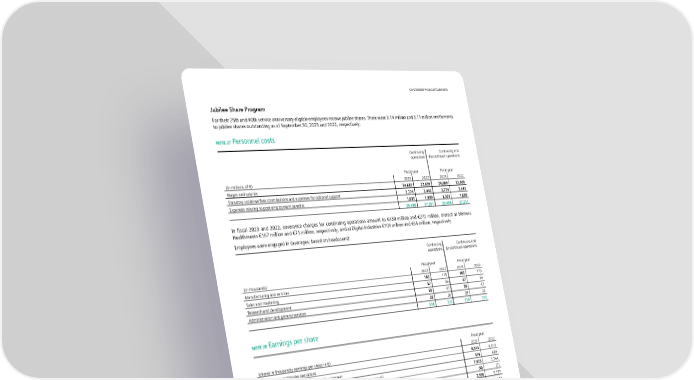 Consolidated Financial Statements Jubilee Share Program For their 25th and 40th service anniversary eligible employees receive jubilee shares. There were 3.14 million and 3.11 million entitlements to jubilee shares outstanding as of September 30, 2023 and 2022, respectively. NOTE 27 Personnel costs Continuing Continuing and operations discontinued operations Fiscal year Fiscal year (in millions of €) 2023 2022 2023 2022 Wages and salaries 24,683 22,659 24,689 22,669 Statutory social welfare contributions and expenses for optional support 3,774 3,442 3,774 3,442 Expenses relating to post-employment benefits 1,031 1,099 1,031 1,099 29,488 27,201 29,494 27,211 In fiscal 2023 and 2022, severance charges for continuing operations amount to €430 million and €272 million, thereof at Siemens Healthineers €167 million and €71 million, respectively, and at Digital Industries €109 million and €64 million, respectively. Employees were engaged in (averages; based on headcount): Continuing Continuing and operations discontinued operations Fiscal year Fiscal year (in thousands) 2023 2022 2023 2022 Manufacturing and services 183 179 183 179 Sales and marketing 57 56 57 56 Research and development 50 47 50 47 Administration and general services 26 26 27 26 316 308 316 308 NOTE 28 Earnings per share Fiscal year (shares in thousands; earnings per share in €) 2023 2022 Income from continuing operations 8,514 4,413 Less: Portion attributable to non-controlling interest 579 669 Income from continuing operations attributable to shareholders of Siemens AG 7,935 3,744 Less: Dilutive effect from share based payment resulting from Siemens Healthineers (4) (7) Income from continuing operations attributable to shareholders of Siemens AG to determine dilutive earnings per share 7,930 3,737 Weighted average shares outstanding - basic 791,538 801,338 Effect of dilutive share-based payment 9,803 8,342 Weighted average shares outstanding - diluted 801,342 809,680 Basic earnings per share (from continuing operations) 10.02 4.67 Diluted earnings per share (from continuing operations) 9.90 4.62 37