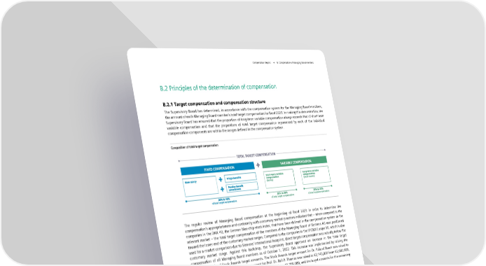 Compensation Report → B. Compensation of Managing Board members B.2 Principles of the determination of compensation B.2.1 Target compensation and compensation structure The Supervisory Board has determined, in accordance with the compensation system for the Managing Board members, the amount of each Managing Board member’s total target compensation for fiscal 2023. In making this determination, the Supervisory Board has ensured that the proportion of long-term variable compensation always exceeds that of short-term variable compensation and that the proportions of total target compensation represented by each of the individual compensation components are within the ranges defined in the compensation system. Composition of total target compensation TOTAL TARGET COMPENSATION FIXED COMPENSATION VARIABLE COMPENSATION Base salary Fringe benefits Short-term variable Long-term variable compensation compensation (Bonus) (Stock Awards) Pension benefit commitment •----------------------4 »----------------------• 36% to 43% 20% to 28% 30% to 42% of total target compensation of total target compensation of total target compensation The regular review of Managing Board compensation at the beginning of fiscal 2023 in order to determine the compensation’s appropriateness and conformity with customary market practices indicated that – when compared to the companies in the DAX 40, the German blue-chip stock index, that have been defined in the compensation system as the relevant market – the total target compensation of the members of the Managing Board of Siemens AG was positioned toward the lower end of the customary market ranges. Compared to the companies in the STOXX Europe 50, which is also used for a market comparison due to Siemens’ international footprint, direct target compensation was actually below the customary market range. Against this backdrop, the Supervisory Board approved an increase in the total target compensation of all Managing Board members as of October 1, 2022. This increase was implemented by raising the individual members’ Stock Awards target amounts. The Stock Awards target amount for Dr. Roland Busch was raised to €3,340,000 from €2,954,000, the target amount for Prof. Dr. Ralf P. Thomas was raised to €2,145,000 from €2,000,000, the target amount for Cedrik Neike was raised to €1,470,000 from €1,259,000, and the target amounts for the remaining Managing Board members were raised to €1,380,000 from €1,259,000. Due to the increase in the Stock Awards target amounts, variable compensation is structured on a more long-term basis, while compensation as a whole is oriented even more toward sustainable Company development. Regarding compensation, all components of the compensation of the position of President and CEO are differentiated. The target amount of Prof. Dr. Ralf P. Thomas’s Stock Awards is differentiated due to his particular responsibilities as CFO. The target amount of Cedrik Neike’s Stock Awards is also differentiated due to the outstanding business results of Digital Industries, the strategic importance of this Business for the further development of Siemens AG and Cedrik Neike’s five- years of membership on the Managing Board. The following table shows the individualized target compensation of each Managing Board member and the relative proportions of total target compensation represented by each of the individual compensation components. FISCAL 2023 10