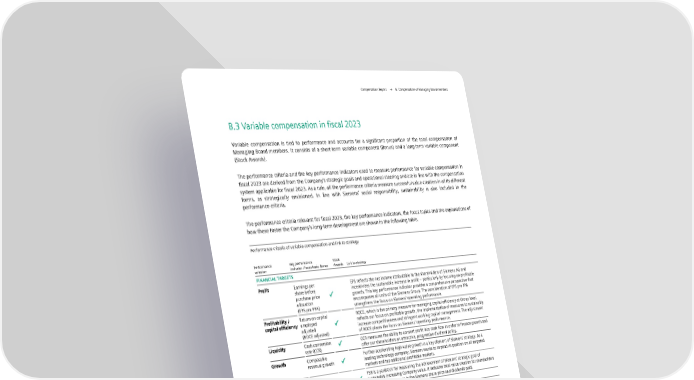 Compensation Report → B. Compensation of Managing Board members B.3 Variable compensation in fiscal 2023 Variable compensation is tied to performance and accounts for a significant proportion of the total compensation of Managing Board members. It consists of a short-term variable component (Bonus) and a long-term variable component (Stock Awards). The performance criteria and the key performance indicators used to measure performance for variable compensation in fiscal 2023 are derived from the Company’s strategic goals and operational steering and are in line with the compensation system applicable for fiscal 2023. As a rule, all the performance criteria measure successful value creation in all its different forms, as strategically envisioned. In line with Siemens’ social responsibility, sustainability is also included in the performance criteria. The performance criteria relevant for fiscal 2023, the key performance indicators, the focus topics and the explanations of how these foster the Company’s long-term development are shown in the following table. Performance criteria of variable compensation and link to strategy Performance Key performance Stock criterion indicator / focus topic Bonus Awards Link to strategy FINANCIAL TARGETS Profit Earnings per EPS reflects the net income attributable to the shareholders of Siemens AG and share before incentivizes the sustainable increase in profit – particularly by focusing on profitable purchase price growth. This key performance indicator provides a comprehensive perspective that allocation encompasses all units of the Siemens Group. The consideration of EPS pre PPA (EPS pre PPA) strengthens the focus on Siemens’ operating performance. Profitability / Return on capital ROCE, which is the primary measure for managing capital efficiency at Group level, capital efficiency employed reflects our focus on profitable growth, the implementation of measures to sustainably adjusted increase competitiveness and stringent working capital management. The adjustment (ROCE adjusted) of ROCE places the focus on Siemens’ operating performance. Liquidity Cash conversion CCR measures the ability to convert profit into cash flow in order to finance growth and rate (CCR) offer our shareholders an attractive, progressive dividend policy. Growth Comparable Further accelerating high-value growth is a key element of Siemens’ strategy. As a revenue growth leading technology company, Siemens wants to expand its position on all targeted markets and tap additional profitable markets. Long-term Total TSR is a yardstick for measuring the achievement of Siemens’ strategic goal of value creation shareholder sustainably increasing Company value. It indicates total value creation for shareholders return (TSR) in the form of increases in the Siemens share price and dividends paid. NON-FINANCIAL, QUALITATIVE TARGETS Various focus Execution of topics The individual targets for executing the Company strategy enable the Company to focus Company on specific factors that are aligned with its short- and medium-term targets and strategy measures in order to ensure its long-term strategic development. The focus topics in fiscal 2023 comprised business development, the implementation of other strategic target setting, optimization / efficiency enhancement and the implementation of portfolio measures. Sustainability Various focus Sustainability / diversity – Siemens honors its social responsibility by fostering topics diversity, inclusion and equal opportunity. Siemens-internal The Siemens-internal ESG/Sustainability index for the 2023 Stock Awards tranche ESG/Sustain- includes: ability index • CO2 emissions – Climate neutrality by 2030 in order to support the 1.5-degree target and thus combat global warming. • Digital learning hours – Focus on learning in order to empower our people to remain resilient and relevant in a constantly changing environment. • Net Promoter Score – Strong customer relationships are the basis for sustainable development both for Siemens and for our customers. FISCAL 2023 13