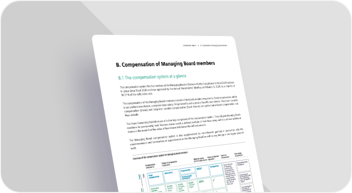 Compensation Report → B. Compensation of Managing Board members B. Compensation of Managing Board members B.1 The compensation system at a glance The compensation system for the members of the Managing Board of Siemens AG that is applicable for fiscal 2023 has been in place since fiscal 2020 and was approved by the Annual Shareholders’ Meeting on February 5, 2020, by a majority of 94.51% of the valid votes cast. The compensation of the Managing Board members consists of fixed and variable components. Fixed compensation, which is not performance-based, comprises base salary, fringe benefits and a pension benefit commitment. Short-term variable compensation (Bonus) and long-term variable compensation (Stock Awards) are performance-based compensation and thus variable. The Share Ownership Guidelines are a further key component of the compensation system. They obligate Managing Board members to permanently hold Siemens shares worth a defined multiple of their base salary and to purchase additional shares in the event that the value of their shares falls below the defined amount. The Managing Board compensation system is also supplemented by commitments granted in connection with the commencement and termination of appointments to the Managing Board as well as any change in the regular place of work. Overview of the compensation system for Managing Board members Compensation Design of compensation Maximum payout Malus and clawback Maximum Other design components components (in % of target amount) regulations compensation characteristics Fixed Base salary Fringe benefits 100% 1 Not applicable Equals the sum Share Ownership compensation of maximum Guidelines amounts that Pension benefit can possibly be commitment paid out to each Managing Board Short-term 33.34% 33.33% 33.33% 200% member from all Commitments variable Siemens Managing Individual compensation in connection with compensation Group Board targets components for the commence- (Bonus) portfolio the relevant ment of appoint- fiscal year ments Long-term 80% 20% 300% Commitments in variable Total shareholder Environment, Social the event of compensation return (TSR) com- and Governance (ESG/ termination of (Stock Awards) pared to MSCI World Sustainability index) appointments Industrials Index Severance cap 1 Fringe benefits are reimbursed up to a maximum amount set by the Supervisory Board. FISCAL 2023 6