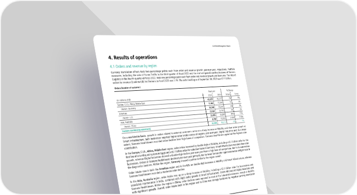 Combined Management Report 4. Results of operations 4.1 Orders and revenue by region Currency translation effects took two percentage points each from order and revenue growth year-over-year, respectively. Portfolio measures, including the sale of Yunex Traffic in the third quarter of fiscal 2022 and the mail and parcel-handling business of Siemens Logistics in the fourth quarter of fiscal 2022, took one percentage point each from order and revenue growth year-over-year. The ratio of orders to revenue (book-to-bill) for Siemens in fiscal 2023 was 1.19. The order backlog as of September 30, 2023 was €111 billion. Orders (location of customer) Fiscal year % Change (in millions of €) 2023 2022 Actual Comp. Europe, C.I.S., Africa, Middle East 42,679 42,373 1% 4% therein: Germany 15,164 15,046 1% 3% Americas 26,540 25,646 3% 3% therein: U.S. 22,093 21,563 2% 2% Asia, Australia 23,085 20,990 10% 15% therein: China 8,798 10,831 (19)% (15)% Siemens (continuing operations) 92,305 89,010 4% 7% On a worldwide basis, growth in orders related to external customers came on a sharp increase at Mobility and clear order growth at Smart Infrastructure; both businesses reported higher order intake across all regions year-over-year. Digital Industries and, to a lesser extent, Siemens Healthineers recorded order declines from high bases of comparison. Siemens Healthineers again had the highest order contribution. In the Europe, C.I.S., Africa, Middle East region, order intake increased by double digits at Mobility, including a €2.5 billion order for the first line of a turnkey rail system in Egypt and a €2.1 billion order for suburban trains in Germany. Smart Infrastructure recorded clear order growth, whereas Digital Industries showed a double-digit decline year-over-year from a high base of comparison, due to its automation businesses. Orders at Siemens Healthineers declined year-over-year primarily due to lower demand for rapid coronavirus antigen tests in the diagnostics business. Within the region, Germany showed a pattern similar to the region overall. Order intake rose in both the Americas region and in the U.S. on double-digit increases at Mobility and Smart Infrastructure, whereas Siemens Healthineers recorded a moderate order decline. In the Asia, Australia region, order intake was up on a sharp increase at Mobility, including a €2.9 billion order for locomotives and associated maintenance in India, combined with slight order growth at Smart Infrastructure. Orders declined at Digital Industries and Siemens Healthineers. Within the region in China, order declines were reported in most of the industrial businesses, except at Mobility with significant growth. Overall, order intake both in the region and in China was strongly burdened by negative currency translation effects. Revenue (location of customer) Fiscal year % Change (in millions of €) 2023 2022 Actual Comp. Europe, C.I.S., Africa, Middle East 36,664 33,481 10% 12% therein: Germany 12,718 11,961 6% 9% Americas 22,615 20,680 9% 9% therein: U.S. 18,561 17,241 8% 7% Asia, Australia 18,489 17,816 4% 10% therein: China 9,367 9,557 (2)% 4% Siemens (continuing operations) 77,769 71,977 8% 11% Worldwide, revenue related to external customers rose significantly at Smart Infrastructure and Digital Industries, while Mobility posted clearly higher revenue growth year-over-year. Revenue at Siemens Healthineers came in level with fiscal 2022 and was again the highest among industrial businesses. Revenue in Europe, C.I.S., Africa, Middle East increased with double-digit growth contributions from Digital Industries and Smart Infrastructure. Mobility reported clear revenue growth, which was held back by portfolio effects stemming from the sale of Yunex traffic in fiscal 2022. Revenues at Siemens Healthineers decreased slightly. Within the region in Germany, the same pattern applied for Digital Industries and Smart Infrastructure, while revenues at Mobility came in flat. A decline in Germany at Siemens Healthineers was primarily due to lower demand for rapid coronavirus antigen tests in the diagnostics business. In the Americas region, revenue was up in all four industrial businesses led by Smart Infrastructure with double-digit growth. Within the region in the U.S., Mobility and Siemens Healthineers reported slight revenue decreases. In the Asia, Australia region, revenue was up by on double-digit increase at Mobility, followed by revenue growth at Digital Industries and Smart Infrastructure. As with orders, revenue development both in the region and in China was held back by strong negative currency 14