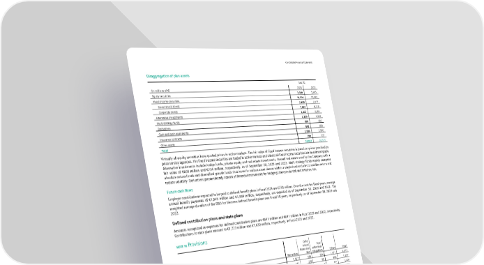 Consolidated Financial Statements Disaggregation of plan assets Sep 30, (in millions of €) 2023 2022 Equity securities 3,360 3,185 Fixed income securities 10,504 10,635 Government bonds 2,639 2,517 Corporate bonds 7,865 8,118 Alternative investments 5,207 5,491 Multi strategy funds 3,329 3,501 Derivatives 499 602 Cash and cash equivalents 818 699 Insurance contracts 2,039 2,090 Other assets 299 321 Total 26,055 26,523 Virtually all equity securities have quoted prices in active markets. The fair value of fixed income securities is based on prices provided by price service agencies. The fixed income securities are traded in active markets and almost all fixed income securities are investment grade. Alternative investments include hedge funds, private equity and real estate investments, thereof real estate used by the Company with a fair value of €608 million and €734 million, respectively, as of September 30, 2023 and 2022. Multi strategy funds mainly comprise absolute return funds and diversified growth funds that invest in various asset classes within a single fund and aim to stabilize return and reduce volatility. Derivatives predominantly consist of financial instruments for hedging interest rate risk and inflation risk. Future cash flows Employer contributions expected to be paid to defined benefit plans in fiscal 2024 are €230 million. Over the next ten fiscal years, average annual benefit payments of €1,945 million and €1,869 million, respectively, are expected as of September 30, 2023 and 2022. The weighted average duration of the DBO for Siemens defined benefit plans was 9 and 10 years, respectively, as of September 30, 2023 and 2022. Defined contribution plans and state plans Amounts recognized as expenses for defined contribution plans are €611 million and €611 million in fiscal 2023 and 2022, respectively. Contributions to state plans amount to €1,723 million and €1,630 million, respectively, in fiscal 2023 and 2022. NOTE 18 Provisions Order related Asset losses and retirement (in millions of €) Warranties risks obligations Other Total Balance as of October 1, 2022 1,497 481 564 1,471 4,013 thereof: non-current 551 235 185 886 1,857 Additions 769 284 5 371 1,428 Usage (388) (156) (11) (198) (753) Reversals (212) (101) (2) (189) (504) Translation differences (46) (37) (5) (30) (118) Accretion expense and effect of changes in discount rates 3 > (3) 4 5 Other changes including reclassifications to held for disposal and disposition of those entities (57) (1) 7 92 42 Balance as of September 30, 2023 1,566 470 556 1,521 4,113 thereof: non-current 585 207 179 823 1,794 The majority of the Company’s provisions are generally expected to result in cash outflows during the next five years. Warranties mainly relate to products sold. Order related losses and risks are provided for anticipated losses and risks on uncompleted construction, sales and leasing contracts. The Company is subject to asset retirement obligations related to certain items of property, plant and equipment. Such asset retirement obligations are primarily attributable to environmental clean-up costs and to costs primarily associated with the removal of leasehold improvements at the end of the lease term. Environmental clean-up costs relate to remediation and environmental protection liabilities which have been accrued based on the estimated costs of decommissioning the site for the production of uranium and mixed-oxide fuel elements in Hanau, Germany (Hanau facilities), as well as for a nuclear research and service center in Karlstein, Germany (Karlstein facilities). In May 2021, Siemens AG and the Federal Republic of Germany entered into a contract under public-law, based on which the obligation of final disposal of nuclear waste is transferred to the Federal Republic of Germany for a payment of €360 million. The contract and therefore the payment is subject to the approval of the EU commission under state-aid rules. Estimation uncertainties still relate to assumptions made to measure the obligations that remain with Siemens AG, regarding conditioning and packaging of nuclear waste, as well as intermediate storage and transport to the final storage facility “Schacht Konrad” or a logistics depot until year-end 2032. As of September 30, 2023, and 2022, the provisions total €480 million and €487 million, respectively. 25