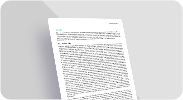 Combined Management Report 8.3 Risks Below we describe the risks that could have a material adverse effect on our business situation, financial condition (including effects on assets, liabilities and cash flows), results of operations and reputation. The order in which the risks are presented in each of the four categories reflects the currently estimated relative exposure for Siemens associated with these risks and thus provides an indication of the risks’ current importance to us. Additional risks not known to us or that we currently consider immaterial may also negatively impact our business objectives and operations. Unless otherwise stated, the risks described below relate to all our organizational units. 8.3.1 Strategic risks Economic, political and geopolitical conditions: We see high uncertainties regarding the global economic and geopolitical outlook, which deteriorated significantly in the past year due to multiple headwinds, all of which may continue to intensify. First, the Israel-Gaza conflict continues to escalate and might cause a larger regional conflict involving further parties. Ongoing risks emanate from the war in Ukraine. Both the Israel-Gaza conflict and the war in Ukraine may have negative impacts on sales development, production processes and purchasing and logistics processes, for example through interruptions in supply chains and energy supplies or bottlenecks affecting components, raw materials and intermediate products. Each of the conflicts could also intensify further to the point of expanding to include other warring parties, including NATO countries, and the use of unconventional weapons. An expansion of the conflicts would have a significant impact on the Siemens market environment. Even the current states of conflicts could have a further negative impact on development of potential crude oil and natural gas supplies. This would fuel inflation, with further risk of a sustained wage-price-spiral. In any case one of the core risks for the Siemens outlook is that central banks may fail to get inflation below their targets and then react more restrictively or even overreact. More restrictive financial conditions would likely push advanced economies into recession and pose a significant risk to vulnerable emerging economies. Highly indebted (emerging and industrialized) countries could suffer from increasing financing costs, further U.S. dollar appreciation, and loss of investor confidence. Other risks could arise for the stability of public finances and the banking sector. Further risks are coming from other geopolitical tensions (particularly associated with the Baltics, Eastern Europe, the Western Balkans, China, Taiwan, and Iran). We continue to face economic risks from a further significant slow-down of the Chinese economy. Key risks are coming from potential financial imbalances, particularly due to the struggling real-estate sector, but also from the growing debt-level of local governments, with growing negative implications for Siemens business in China and the country’s trading partners. Obstruction and redefinitions of international cooperation agreements could severely impact our business. First and foremost a more extensive U.S.-China decoupling would have adverse effects on confidence and investment activity and would severely hit Siemens’ business. Increasing trade barriers, protectionism, sanctions and in particular technical regulations would negatively impact production costs and productivity along our global value chains, as well as significantly impede or even hinder access to sales markets. A significant risk to our sales potential and cost structures is coming from the possibility of renewed supply chain bottlenecks, due to growing lack of availability of intermediate goods, in particular electronic components. Furthermore, grid-lock in U.S. politics could weigh on U.S. growth with the risk of a global spillover. We are dependent on the economic development of certain industries; a continuation or even an intensification of the cyclical and structural headwinds in core customer industries, e.g. automotive or construction, would have adverse impact on our business prospects. A resurgence of COVID-19 or even the outbreak of a new pandemic, a terrorist attack, a significant cybercrime incident, or a series of such attacks or incidents in major economies, could depress economic activity globally and undermine consumer and business confidence. Additionally, the highly interconnected global economy remains vulnerable to natural disasters or hybrid warfare. If we are not successful in adapting our production and cost structure to subsequent changes in conditions in the markets in which we operate, there can be no assurance that we will not experience adverse effects. For example, our customers may modify, delay or cancel plans to purchase our products, solutions and services, or fail to follow through on purchases or contracts already executed. In addition, it may become more difficult for our customers to obtain financing. Contracted payment terms, especially regarding the level of advance payments by our customers relating to long-term projects, may become less favorable, which could negatively impact our financial condition. Siemens’ global setup with operations in almost all relevant economies, our wide range of offerings with varied exposures to business cycles, and our balanced mix of business models (e.g. equipment, components, systems, software, services and solutions) help us to absorb impacts from adverse developments in any single market. Portfolio measures, at-equity investments, other investments and strategic alliances: Our strategy includes divesting our activities in some business areas and strengthening others through portfolio measures, including mergers and acquisitions. With respect to divestments, we may not be able to divest some of our activities as planned, and the divestitures we do carry out could have a negative