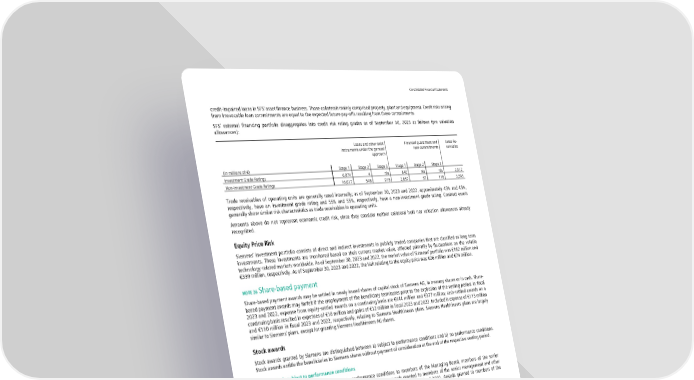 Consolidated Financial Statements credit-impaired loans in SFS’ asset finance business. Those collaterals mainly comprised property, plant and equipment. Credit risks arising from irrevocable loan commitments are equal to the expected future pay-offs resulting from these commitments. SFS’ external financing portfolio disaggregates into credit risk rating grades as of September 30, 2023 as follows (pre valuation allowances): Loans and other debt Financial guarantees and Lease Re- instruments under the general loan commitments ceivables approach (in millions of €) Stage 1 Stage 2 Stage 3 Stage 1 Stage 2 Stage 3 Investment Grade Ratings 6,074 4 n/a 840 n/a n/a 2,512 Non-Investment Grade Ratings 16,017 548 918 2,857 67 118 3,593 Trade receivables of operating units are generally rated internally; as of September 30, 2023 and 2022, approximately 45% and 45%, respectively, have an investment grade rating and 55% and 55%, respectively, have a non-investment grade rating. Contract assets generally show similar risk characteristics as trade receivables in operating units. Amounts above do not represent economic credit risk, since they consider neither collateral held nor valuation allowances already recognized. Equity Price Risk Siemens‘ investment portfolio consists of direct and indirect investments in publicly traded companies that are classified as long term investments. These investments are monitored based on their current market value, affected primarily by fluctuations on the volatile technology-related markets worldwide. As of September 30, 2023 and 2022, the market value of Siemens’ portfolio was €182 million and €339 million, respectively. As of September 30, 2023 and 2022, the VaR relating to the equity price was €26 million and €74 million. NOTE 26 Share-based payment Share-based payment awards may be settled in newly issued shares of capital stock of Siemens AG, in treasury shares or in cash. Share- based payment awards may forfeit if the employment of the beneficiary terminates prior to the expiration of the vesting period. In fiscal 2023 and 2022, expense from equity-settled awards on a continuing basis are €444 million and €377 million; cash-settled awards on a continuing basis resulted in expenses of €18 million and gains of €12 million in fiscal 2023 and 2022. Included is expense of €113 million and €110 million in fiscal 2023 and 2022, respectively, relating to Siemens Healthineers plans. Siemens Healthineers plans are largely similar to Siemens’ plans, except for granting Siemens Healthineers AG shares. Stock awards Stock awards granted by Siemens are distinguished between a) subject to performance conditions and b) no performance conditions. Stock awards entitle the beneficiaries to Siemens shares without payment of consideration at the end of the respective vesting period. Stock awards subject to performance conditions The Company grants stock awards subject to performance conditions to members of the Managing Board, members of the senior management and other eligible employees. The vesting period for awards granted to members of the senior management and other eligible employees is three years respectively four years for awards granted prior to fiscal 2022. Awards granted to members of the Managing Board are subject to a four year vesting period. For stock awards subject to performance conditions, 80% of the target amount is linked to the relative total shareholder return of Siemens compared to the total shareholder return of the MSCI World Industrials sector index (TSR-Target); the remaining 20% are linked to a Siemens internal sustainability target considering environmental, social and governance targets (ESG-Target). The annual target amount for stock awards up to and including tranche 2019 is linked to the share price performance of Siemens relative to the share price performance of five important competitors. The target attainment for each individual performance criteria ranges between 0% and 200%. Settlement of the awards is in shares corresponding to the actual target attainment. Commitments to members of the Managing Board Fair values of TSR-related stock awards granted are €7 million and €6 million, respectively, in fiscal 2023 and 2022, calculated by applying a valuation model. In fiscal 2023 and 2022, inputs to that model include an expected weighted volatility of Siemens shares of 26.71% and 24.41%, respectively, and a Siemens share price of €130.68 and €153.34. Expected volatility was determined by reference to historic volatilities. The model applies a risk-free interest rate of up to 2.76% and (0.15)% in fiscal 2023 and 2022, respectively, and an expected dividend yield of 3.25% in fiscal 2023 and 2.61% in fiscal 2022. Assumptions relating to correlations between the Siemens share price and the development of the MSCI index were derived from historic observations of share price and index changes. The fair value of the ESG component of €112.39 and €135.25 per share in fiscal 2023 and 2022, respectively, was determined as Siemens’ share price, less the present value of expected dividends during the vesting period. Commitments to members of the senior management and other eligible employees In fiscal 2023 and 2022, 1,784,892 and 1,459,182 equity-settled stock awards were granted relating to the TSR-Target with a fair value of €114 million and €106 million, respectively. In fiscal 2023 and 2022, 446,237 and 365,610 equity-settled stock awards were granted relating to the ESG-Target with a fair value of €54 million and €51 million, respectively. The fair value of stock awards granted in fiscal 2023 and 2022 (TSR-related) was calculated by applying a valuation model. In fiscal 2023 and 2022, inputs to that model include an expected weighted volatility of Siemens shares of 26.70% and 24.41%, respectively, and a 35