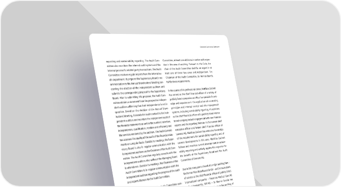 Corporate Governance Statement reporting and sustainability reporting. The Audit Com Committee, at least one additional member with exper mittee also monitors the internal audit system and the tise in the area of auditing. Pursuant to the Code, the internal process for related party transactions. The Audit chair of the Audit Committee shall be an expert in at Committee receives regular reports from the internal au least one of these two areas and independent. The dit department. It prepares the Supervisory Board’s rec Chairman of the Audit Committee, Dr. Werner Brandt, ommendation to the Annual Shareholders’ Meeting con fulfills these requirements. cerning the election of the independent auditors and submits the corresponding proposal to the Supervisory In the course of his professional career, Matthias Zachert has served as the chief financial officer of a variety of Board. Prior to submitting this proposal, the Audit Com mittee obtains a statement from the prospective indepen publicly listed companies and thus has specialist knowl dent auditors affirming that their independence is not in edge and experience in the application of accounting question. Based on the decision of the Annual Share principles and internal control and risk management holders’ Meeting, it awards the audit contract to the inde systems, including sustainability reporting. His activities pendent auditors and monitors the independent audit of as the chief financial officer of a publicly listed interna the financial statements as well as the auditors’ selection, tional company include engagement with nonfinancial independence, qualification, rotation and efficiency and aspects and the reporting thereon. As the current chief the services rendered by the auditors. The Audit Commit executive officer and former chief financial officer of tee assesses the quality of the audit of the financial state Lanxess AG, Matthias Zachert has extensive knowledge ments on a regular basis. Outside its meetings, the Super of the requirements for sustainability reporting and of visory Board is also in regular communication with the current developments in this area. Matthias Zachert independent auditors via the Chairman of the Audit Com follows and monitors current developments in sustain mittee. The Audit Committee regularly consults with the ability reporting and actively applies this expertise for independent auditors also without the Managing Board the benefit of the Supervisory Board and the Audit in attendance. Outside its meetings, the Chairman of the Committee of Siemens AG. Audit Committee is in regular communication with the independent auditors regarding the progress of the audit Due to his many years of work at a major auditing firm – and reports thereon to the Audit Committee. the former Price Waterhouse GmbH – and his many years of service as the chief financial officer of publicly listed As of September 30, 2023, the Audit Committee com international companies – Fresenius Medical Care AG prised Dr. Werner Brandt (Chairman), Tobias Bäumler, and, subsequently, SAP AG – Dr. Werner Brandt has Bettina Haller, Martina Merz, Hagen Reimer, Jim specialist knowledge and experience in the auditing of Hagemann Snabe, Birgit Steinborn and Matthias Zachert. financial statements. Due to his abovementioned activ The members of the Audit Committee are, as a group, ities and his many years of experience as the chairman familiar with the sector in which the Company operates. of the supervisory board and audit committee of various Pursuant to the German Stock Corporation Act, the publicly listed international companies, he also has Supervisory Board must have at least one member with specialist knowledge and experience in the application expertise in the area of accounting and at least one of accounting principles and internal control and risk additional member with expertise in the auditing of management systems and thus has expertise in the financial statements. According to the Code, expertise in area of accounting. In addition, Dr. Werner Brandt is the area of accounting consists of specialist knowledge independent. As former chief financial officer of various and experience in the application of accounting prin companies and as the current chairman of the super ciples and internal control and risk management visory board of RWE AG and Chairman of the Audit systems, while expertise in the area of auditing consists Committee of Siemens AG, Dr. Werner Brandt also has of specialist knowledge and experience in the auditing extensive knowledge regarding sustainability reporting. of financial statements. Accounting and auditing also Dr. W erner Brandt follows current developments in include sustainability reporting and its audit and assur sustainability reporting and its audit and assurance and ance. In the person of Matthias Zachert, the Supervisory is an active participant in discussions of this topic in Board and the Audit Committee have at least one mem expert committees. He actively applies this expertise for ber with expertise in the area of accounting and in the the benefit of the Supervisory Board and the Audit person of Dr. Werner Brandt, the Chairman of the Audit Committee of Siemens AG. 7