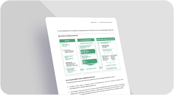Compensation Report → B. Compensation of Managing Board members The remaining number of Stock Awards is settled by the transfer of Siemens shares to the relevant Managing Board member. Basic principles and functioning of Stock Awards Allocation Four-year vesting period Settlement after expiration of vesting period ■ ■ Target amount Performance range 0%-200% Number of Stock Awards based (based on 100% target on target achievement achievement) Total shareholder return (TSR) compared to sector index x Siemens share price (weighting: 80%) (Xetra closing price on x 2 (Extrapolation to transfer date) maximum possible target 1-year » 3-year achievement of 200%) reference! ) performance = Value of Stock Awards in € period j period (Cap: 300% of target amount) = Maximum allocation Siemens-internal amount ESG/Sustainability index (based on 200% target (weighting: 20%) > 300% of target amount S 300% of target amount achievement) Number of Stock Awards Number of Stock Awards based on target based on target 4-year achievement is reduced achievement -r- Allocation price performance by amount by which = final number of (Xetra closing price on the period cap is exceeded Stock Awards allocation date, less the estimated discounted dividends) = Maximum number = Final number of Stock Awards of Stock Awards Actual target achievement (based on 200% target achievement) Settlement by transfer of Siemens shares to Managing Board member B.3.2.2 ALLOCATION OF STOCK AWARDS IN FISCAL 2023 The Supervisory Board approved the following performance criteria for the 2023 Stock Awards tranche: → “Long-term value creation,” measured in terms of the development of the TSR of Siemens AG relative to the international sector index MSCI World Industrials and → “Sustainability,” measured in terms of the Siemens-internal ESG/Sustainability index, which is based on the following three equally weighted key performance indicators. Target setting for the three key performance indicators is oriented on the Company’s strategic sustainability planning, which is described in detail in Siemens’ sustainability reporting. FISCAL 2023 21