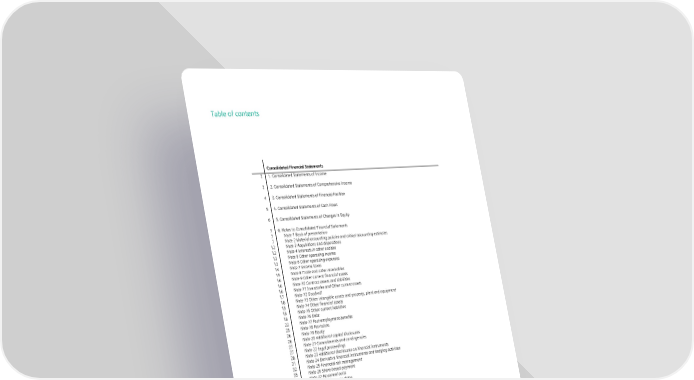 Table of contents Consolidated Financial Statements 3 1. Consolidated Statements of Income 3 2. Consolidated Statements of Comprehensive Income 4 3. Consolidated Statements of Financial Position 5 4. Consolidated Statements of Cash Flows 6 5. Consolidated Statements of Changes in Equity 7 6. Notes to Consolidated Financial Statements 7 Note 1 Basis of presentation 7 Note 2 Material accounting policies and critical accounting estimates 12 Note 3 Acquisitions and dispositions 12 Note 4 Interests in other entities 13 Note 5 Other operating income 13 Note 6 Other operating expenses 14 Note 7 Income taxes 15 Note 8 Trade and other receivables 16 Note 9 Other current financial assets 16 Note 10 Contract assets and liabilities 16 Note 11 Inventories and Other current assets 17 Note 12 Goodwill 18 Note 13 Other intangible assets and property, plant and equipment 19 Note 14 Other financial assets 19 Note 15 Other current liabilities 19 Note 16 Debt 22 Note 17 Post-employment benefits 25 Note 18 Provisions 26 Note 19 Equity 26 Note 20 Additional capital disclosures 27 Note 21 Commitments and contingencies 27 Note 22 Legal proceedings 28 Note 23 Additional disclosures on financial instruments 31 Note 24 Derivative financial instruments and hedging activities 32 Note 25 Financial risk management 35 Note 26 Share-based payment 37 Note 27 Personnel costs 37 Note 28 Earnings per share 38 Note 29 Segment information 41 Note 30 Information about geographies 41 Note 31 Related party transactions 42 Note 32 Principal accountant fees and services 42 Note 33 Corporate governance 42 Note 34 Subsequent events 43 Note 35 List of subsidiaries and associated companies pursuant to Section 313 para. 2 of the German Commercial Code