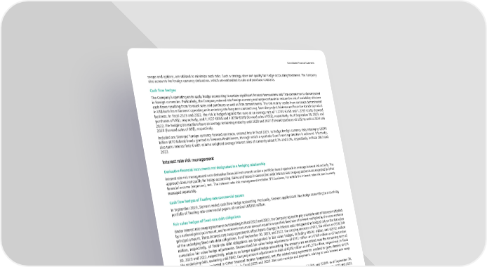 Consolidated Financial Statements swaps and options, are utilized to minimize such risks. Such a strategy does not qualify for hedge accounting treatment. The Company also accounts for foreign currency derivatives, which are embedded in sale and purchase contracts. Cash flow hedges The Company’s operating units apply hedge accounting to certain significant forecast transactions and firm commitments denominated in foreign currencies. Particularly, the Company entered into foreign currency exchange contracts to reduce the risk of variability of future cash flows resulting from forecast sales and purchases as well as firm commitments. The risk mainly results from contracts denominated in US$ both from Siemens’ operating units entering into long-term contracts e.g. from the project business and from the standard product business. In fiscal 2023 and 2022, the risk is hedged against the euro at an average rate of 1.2780 €/US$ and 1.2293 €/US$ (forward purchases of US$), respectively, and 1.1027 €/US$ and 1.0258 €/US$ (forward sales of US$), respectively. As of September 30, 2023, and 2022, the hedging transactions have an average remaining maturity until 2028 and 2027 (forward purchases of US$) as well as 2024 and 2023 (forward sales of US$), respectively. Included are Siemens’ foreign currency forward contracts, entered into in fiscal 2021, to hedge foreign currency risks relating to US$10 billion (€10 billion) bonds granted to Siemens Healthineers, through which a synthetic Euro financing structure is achieved. It factually, also turns interest into € with volume weighted average interest rates of currently about 0.7% and 0.3%, respectively, in fiscal 2023 and 2022. Interest rate risk management Derivative financial instruments not designated in a hedging relationship Interest rate risk management uses derivative financial instruments under a portfolio-based approach to manage interest risk actively. The approach does not qualify for hedge accounting. Gains and losses in connection with interest rate swap agreements are recorded in Other financial income (expenses), net. The interest rate risk management includes SFS business, for which the interest rate risk was formerly managed separately. Cash flow hedges of floating-rate commercial papers In September 2023, Siemens ended cash flow hedge accounting. Previously, Siemens applied cash flow hedge accounting to a revolving portfolio of floating-rate commercial papers of nominal US$200 million. Fair value hedges of fixed-rate debt obligations Under interest rate swap agreements outstanding in fiscal 2023 and 2022, the Company agreed to pay a variable rate of interest multiplied by a notional principal amount, and to receive in return an amount equal to a specified fixed rate of interest multiplied by the same notional principal amount. These interest rate swap agreements offset future changes in interest rates designated as hedged risk on the fair value of the underlying fixed-rate debt obligations. As of September 30, 2023, and 2022, the carrying amounts of €13,164 million and €10,718 million, respectively, of fixed-rate debt obligations are designated in fair value hedges, including €(876) million and €(973) million cumulative fair value hedge adjustments. Unamortized fair value hedge adjustments of €112 million and €169 million as of September 30, 2023 and 2022, respectively, relate to no longer applied hedge accounting. The amounts are amortized over the remaining term of the underlying debt, maturing until 2042. Carrying amount adjustments to debt of €(95) million and €1,273 million, respectively, in fiscal 2023 and 2022 are included in Other financial income (expenses), net; the related swap agreements resulted in gains (losses) of €74 million and €(1,236) million, respectively, in fiscal 2023 and 2022. Net cash receipts and payments relating to such interest rate swap agreements are recorded as interest expenses. The Company had interest rate swap contracts to pay variable rates of interest of an average of 3.00% and (0.86% as of September 30, 2023 and 2022, respectively and received fixed rates of interest (average rate of 1.81% and 1.07%, as of September 30, 2023 and 2022, respectively). The notional amount of indebtedness hedged as of September 30, 2023 and 2022 was €13,687 million and €11,719 million, respectively. This changed 33% and 26% of the Company’s underlying notes and bonds from fixed interest rates into variable interest rates as of September 30, 2023 and 2022, respectively. The notional amounts of these contracts mature at varying dates based on the maturity of the underlying hedged items. The net fair value of interest rate swap contracts (excluding accrued interest) used to hedge indebtedness as of September 30, 2023 and 2022 was €(844) million and €(959) million, respectively. NOTE 25 Financial risk management Increasing market fluctuations may result in significant earnings and cash flow volatility risk for Siemens. The Company’s operating business as well as its investment and financing activities are affected particularly by changes in foreign exchange rates and interest rates. In order to optimize the allocation of financial resources across Siemens' segments and entities, as well as to achieve its aims, Siemens identifies, analyzes and manages the associated market risks. The Company seeks to manage and control these risks primarily through its regular operating and financing activities and uses derivative financial instruments when deemed appropriate. Foreign currency exchange rate risk is quantified based on a sensitivity analysis. In order to quantify remaining market risks Siemens has implemented a system based on Value at Risk (VaR), which is also used for internal management of Corporate Treasury activities. The VaR figures are calculated based on historical volatilities and correlations of various risk factors, a ten day holding period, and a 99.5% confidence
