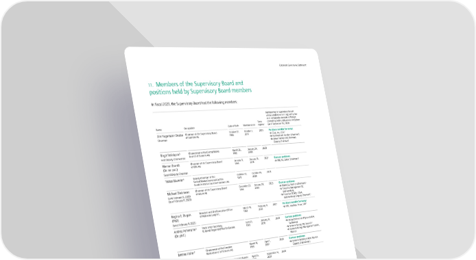 Corporate Governance Statement 11. Members of the Supervisory Board and positions held by Supervisory Board members In fiscal 2023, the Supervisory Board had the following members: Memberships in supervisory boards whose establishment is required by law or in comparable domestic or foreign Term controlling bodies of business enterprises Name Occupation Date of birth Member since expires 1 (as of September 30, 2023) Jim Hagemann Snabe Chairman of the Supervisory Board October 27, October 1, 2025 Positions outside Germany: of Siemens AG 1965 2013 3 Chairman C3.ai, Inc., USA Northvolt AB, Sweden (Chairman) Urban Partners A/S, Denmark (Deputy Chairman) 2 Chairwoman of the Central Works March 26, January 24, 2028 Birgit Steinborn First Deputy Chairwoman Council of Siemens AG 1960 2008 Werner Brandt Chairman of the Supervisory Board January 3, January 31, 2027 German positions: of RWE AG 1954 2018 3 (Dr. rer. pol.) RWE AG, Essen (Chairman) Second Deputy Chairman 2 Deputy Chairman of the October 10, October 16, 2028 Tobias Bäumler Central Works Council and of the 1979 2020 Combine Works Council of Siemens AG Michael Diekmann Chairman of the Supervisory Board December 23, January 24, 2023 German positions: of Allianz SE 1954 2008 3 (until February 9, 2023) Allianz SE, Munich (Chairman) (as of February 9, 2023) Fresenius Management SE, Bad Homburg Fresenius SE & Co. KGaA, 3 Bad Homburg (Deputy Chairman) Regina E. Dugan President and Chief Executive Officer March 19, February 9, 2027 Positions outside Germany: of Wellcome Leap Inc. 1963 2023 3 (PhD) HPE, Houston, Texas, USA (since February 9, 2023) Andrea Fehrmann 2 Trade Union Secretary, June 21, January 31, 2028 German positions: (Dr. phil.) IG Metall Regional Office for Bavaria 1970 2018 Airbus Defence and Space GmbH, Taufkirchen 3 Siemens Energy AG, Munich Siemens Energy Management GmbH, Munich 2 Chairwoman of the Combine March 14, April 1, 2028 German positions: Bettina Haller Works Council of Siemens AG 1959 2007 Siemens Mobility GmbH, Munich (Deputy Chairwoman) 2 Head of the Regional Office Erlangen / Nurem April 25, September 14, 2028 Oliver Hartmann (since September 14, berg, Germany, Chairman of the Committee 1968 2023 2023) of Spokespersons of the Siemens Group and Chairman of the Central Committee of Spokespersons of Siemens AG Keryn Lee James Chair of the Board of Directors December 12, February 9, 2027 Positions outside Germany: (since February 9, 2023) of OPUS Talent Solutions 1968 2023 OPUS Talent Solutions, UK (Chair) 2 Chairman of the March 16, January 24, 2028 Harald Kern Siemens Europe Committee 1960 2008 2 Chief Treasurer and Executive Member January 22, January 25, 2028 German positions: Jürgen Kerner of the Managing Board of IG Metall 1969 2012 Airbus GmbH, Hamburg MAN Truck & Bus SE, Munich (Deputy Chairman) 3 Siemens Energy AG, Munich Siemens Energy Management GmbH, Munich Thyssenkrupp AG, Essen 3 (Deputy Chairman) 3 Traton SE, Munich Martina Merz Member of supervisory boards March 1, February 9, 2027 Positions outside Germany: 1963 2023 3 (since February 9, 2023) AB Volvo, Gothenburg, Sweden 2 Innovation manager at Siemens Mobility June 2, February 9, 2028 German positions: Christian Pfeiffer (Dr.Ing.) GmbH, member of the Combine Works 1969 2023 Siemens Mobility GmbH, Munich Council of Siemens AG and of the Central (Chairman) (since February 9, 2023) Works Council of Siemens Mobility GmbH Benoît Potier Chairman of the Board of Directors September 3, January 31, 2027 Positions outside Germany: of L’Air Liquide S. A. 1957 2018 3 L’Air Liquide S. A., France (Chairman) 1 As a rule, the term of office ends at the conclusion of the (relevant) ordinary Annual Shareholders’ Meeting. 2 Employee representative. 3 Publicly listed. 4 Shareholders’ Committee. 17