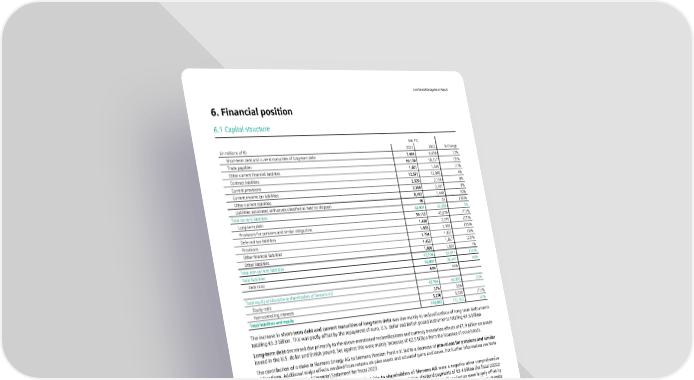 Combined Management Report 6. Financial position 6.1 Capital structure Sep 30, (in millions of €) 2023 2022 % Change Short-term debt and current maturities of long-term debt 7,483 6,658 12% Trade payables 10,130 10,317 (2)% Other current financial liabilities 1,601 1,616 (1)% Contract liabilities 12,571 12,049 4% Current provisions 2,320 2,156 8% Current income tax liabilities 2,566 2,381 8% Other current liabilities 8,182 7,448 10% Liabilities associated with assets classified as held for disposal 50 61 (19)% Total current liabilities 44,901 42,686 5% Long-term debt 39,113 43,978 (11)% Provisions for pensions and similar obligations 1,426 2,275 (37)% Deferred tax liabilities 1,655 2,381 (30)% Provisions 1,794 1,857 (3)% Other financial liabilities 1,453 1,867 (22)% Other liabilities 1,666 1,654 1% Total non-current liabilities 47,106 54,011 (13)% Total liabilities 92,007 96,697 (5)% Debt ratio 63% 64% Total equity attributable to shareholders of Siemens AG 47,791 48,895 (2)% Equity ratio 37% 36% Non-controlling interests 5,270 5,910 (11)% Total liabilities and equity 145,067 151,502 (4)% The increase in short-term debt and current maturities of long-term debt was due mainly to reclassifications of long-term instruments totaling €5.3 billion. This was partly offset by the repayment of euro, U.S. dollar and British pound instruments totaling €4.6 billion. Long-term debt decreased due primarily to the above-mentioned reclassifications and currency translation effects of €1.9 billion on bonds issued in the U.S. dollar and British pound. Set against this were mainly increases of €2.5 billion from the issuance of euro bonds. The contribution of a stake in Siemens Energy AG to Siemens Pension-Trust e.V. led to a decrease of provisions for pensions and similar obligations. Additional major effects resulted from returns on plan assets and actuarial gains and losses. For further information see Note 17 in Notes to Consolidated Financial Statement for fiscal 2023. The main factors for the decrease in total equity attributable to shareholders of Siemens AG were a negative other comprehensive income, net of income taxes, of €4.0 billion resulting mainly from currency translation; dividend payments of €3.4 billion (for fiscal 2022); and changes in equity totaling €1.6 billion resulting from an equity transaction at Siemens Energy AG. These factors were largely offset by €7.9 billion in net income attributable to shareholders of Siemens AG. In fiscal 2023, Siemens cancelled 50 million treasury shares, thereby reducing issued capital by €150 million and retained earnings by €5.1 billion. Capital structure ratio Our capital structure ratio as of September 30, 2023 decreased to 0.6 from 1.0 a year earlier. The change was due to a decrease in Industrial net debt and a higher EBITDA. Debt and credit facilities As of September 30, 2023, we recorded, in total, €40.9 billion in notes and bonds, €2.2 billion in loans from banks, €0.5 billion in other financial indebtedness and €2.9 billion in lease liabilities. Notes and bonds were issued mainly in the U.S. dollar and the euro, and to a lesser extent in the British pound. We have credit facilities totaling €7.5 billion which were unused as of September 30, 2023. For further information about our debt see Note 16 in Notes to Consolidated Financial Statements for fiscal 2023. For further information about the functions and objectives of our financial risk management see Note 25 in Notes to Consolidated Financial Statements for fiscal 2023. 17