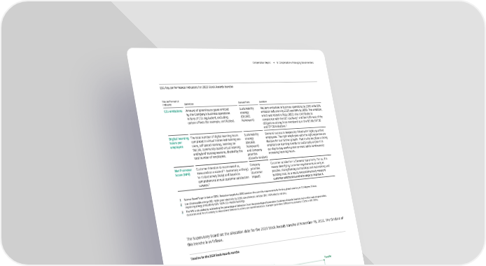 Compensation Report → B. Compensation of Managing Board members ESG key performance indicators for 2023 Stock Awards tranche Key performance indicator Definition Derived from Ambition CO2 emissions Amount of greenhouse gases emitted Sustainability Net zero emissions in business operations by 2030 with 55% by the Company's business operations strategy emission reduction by 2025 and 90% by 2030. This ambition, in tons of CO2 equivalent, excluding (DEGREE which was raised in fiscal 2022, also contributes to 1 carbon offsets (for example, certificates). framework) compliance with the SBTi pathway and the fulfilment of the obligations arising from membership in the RE100, EV100 2 and EP100 initiatives. Digital learning The total number of digital learning hours Sustainability Siemens' success is inseparably linked with highly qualified hours per completed in virtual trainer-led training ses- strategy employees. The right employees with the right expertise are employee sions, self-paced learning, learning on (DEGREE decisive for our further growth. That is why we place a strong the job, community-based virtual learning framework) emphasis on learning in order to sustainably anchor it in and hybrid training sessions, divided by the and Company our day-to-day working environment while continuously total number of employees. priorities increasing learning hours. (Growth mindset) Net Promoter Customer intention to recommend us, Company Customer satisfaction is Siemens' top priority. For us, this Score (NPS) measured on a scale of 1 (extremely unlikely) priorities means identifying customer requirements as early as to 10 (extremely likely) and based on (Customer possible, strengthening partnerships and maintaining and comprehensive annual customer satisfaction impact) building trust. As a result, we systematically measure 3 surveys. customer satisfaction and take steps to improve it. 1 Science Based Target Initiative (SBTi): Reduction targets for 2030 based on the scientific requirements for limiting global warming to 1.5 degrees Celsius. 2 Use of renewable energy (RE): 100% green electricity by 2030; use of electric vehicles (EV): 100% electric vehicles; improving energy productivity (EP): 100% CO2-neutral buildings. 3 The NPS is calculated by subtracting the percentage of detractors from the percentage of promoters. Customers that rate Siemens high on the scale are promoters. Customers that find it unlikely to recommend Siemens to others are named detractors. Example: promoters (55%) minus detractors (10%) = NPS (45%). The Supervisory Board set the allocation date for the 2023 Stock Awards tranche at November 18, 2022. The timeline of this tranche is as follows. Timeline for the 2023 Stock Awards tranche Allocation and four-year vesting period Transfer Process sequence OCT '22 | NOV '22 OCT '23 NOV '23 2024 2025 SEPT '26 OCT '26 j NOV '26 ▲ k ▲ 1 ♦ ▼♦ 1F * ♦ Performance measurement TSR reference period TSR performance period ESG performance measurement based on interim targets for each fiscal year The target amounts, the maximum allocation amounts, the maximum number of Stock Awards allocated and the fair value at allocation date in accordance with IFRS 2 Share-based Payment are shown in the following table. The allocation price applicable for the 2023 tranche was €114.22. FISCAL 2023 22