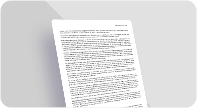Independent Auditor’s Reports (Group) Revenues, total estimated contract costs and profit recognition may deviate significantly from original estimates based on new knowledge about cost overruns and changes in project scope over the term of a construction-type contract. The effects of current geopolitical and macroeconomic developments on the project business, such as delays in project execution, price increases or disruptions in supply chains and their accounting treatment were taken into account during our audit. Auditor’s response: As part of our audit, we obtained an understanding of the Group’s internally established methods, processes and control mechanisms for project management in the bid and execution phase of construction-type contracts. In this regard, we assessed the design and operating effectiveness of the accounting-related internal controls in the project business by obtaining an understanding of business transactions specific to construction-type contracts, from the initiation of the transaction through presentation in the consolidated financial statements. We also tested controls addressing the timely assessment of changes in cost estimates, the timely and complete recognition of such changes in the project calculation as well as their accounting treatment. As part of our substantive audit procedures, which particularly involved project reviews, we evaluated management’s estimates and assumptions based on a risk-based selection of a sample of contracts. Our sample primarily included projects that are subject to significant future uncertainties and risks, such as projects with complex safety/technical and regulatory requirements or projects with a large portion of materials and services to be provided by suppliers or consortium partners, fixed-price or turnkey projects, cross-border projects and projects with changes in cost estimates, delays and/or low or negative margins. Our audit procedures included, among others, review of the contracts and their terms and conditions including contractually agreed partial deliveries and services, termination rights, penalties for delay and breach of contract, liquidated damages as well as joint and several liability. In order to evaluate whether revenues were recognized on an accrual basis for the selected projects, we analyzed revenues attributable to the fiscal year and corresponding cost of sales to be recognized in the statement of income considering the extent of progress towards completion and examined the accounting for the associated items in the statement of financial position. For this we also assessed the accounting for contractually agreed options, contract amendments or contract terminations (including related pending legal proceedings) also in relation to previous construction-type contracts with Russian customers. We also assessed the recognition requirements of reimbursement claims. We further performed inquiries of project management (both commercial and technical project managers) with respect to the development of the projects, the reasons for deviations between planned and actual costs, the current estimated costs to complete the projects, and management’s assessments on probabilities that contract risks and claims from joint and several liability will materialize. To identify anomalies in the development of margins and other project KPIs, we also applied data analysis procedures. In designing our audit procedures, we also considered results from project audits conducted by the internal audit function. Furthermore, we obtained evidence from third parties for selected projects (e.g., project acceptance documentation, contractual terms and conditions, and lawyers’ confirmations regarding alleged breaches of contract and asserted claims) and inspected the status of projects at plant sites. Due to the large contract volume and risk profile, our audit procedures focused on large contracts for delivery of high-speed and commuter trains. Our audit procedures did not lead to any reservations relating to revenue recognition on construction-type contracts. Reference to related disclosures: With regard to the recognition and measurement policies applied in accounting for construction-type contracts, refer to Note 2 Material accounting policies and critical accounting estimates in the notes to the consolidated financial statements. With respect to contract assets and liabilities as well as provisions for order related losses and risks, refer to Note 10 Contract assets and liabilities, Note 18 Provisions and Note 21 Commitments and contingencies in the notes to the consolidated financial statements. Valuation of the investment in Siemens Energy AG Reasons why the matter was determined to be a key audit matter: Since the spin-off of Siemens Energy AG in September 2020, Siemens AG has held a 35.1% stake in the listed Siemens Energy AG which was reduced to 25.1% due to capital measures at Siemens Energy AG and the contribution of shares in Siemens Energy AG to the Siemens Pension-Trust e.V. in fiscal year 2023. The investment is accounted for as an associate, applying the equity method in accordance with IAS 28, Investments in Associates and Joint Ventures. As of June 30, 2022, an impairment was recognized on the investment. During the first six months of the financial year 2023, the market capitalization of the investment was mostly higher than the value at the time of the impairment. As of March 31, 2023, the latter was significantly exceeded. As a result, an impairment reversal was made in accordance with IAS 36, Impairment of Assets, in the amount of the increase in the stock market price since the date of the impairment until March 31, 2023. In addition, Siemens Energy AG acquired additional shares in Siemens Gamesa Renewable Energy, S.A. in fiscal year 2023. This led to a reduction in equity in the consolidated financial statements of Siemens Energy AG. The recognition of Siemens’ share in this equity transac