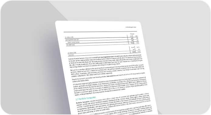 Combined Management Report Fiscal year (in millions of €) 2023 2022 Earnings before taxes (EBT) 563 498 therein: equity business 201 269 ROE (after taxes) 16.3% 15.6% Sep 30, Sep 30, (in millions of €) 2023 2022 Total assets 32,915 33,263 Siemens Financial Services in fiscal 2023 recorded higher earnings before taxes in the debt business despite a volatile credit environment. In the prior period, earnings before taxes were burdened by €0.2 billion in connection with the sale of the financing and leasing business in Russia at the end of the fiscal year. The equity business recorded strong results. While both periods under review included gains from the sales of equity investments, fiscal 2022 additionally included higher gains from fair value measurements of investments and gains from energy-related investments in connection with rising prices in global energy markets. Net cash from operations (defined as the sum of cash flows from operating and investing activities) amounted to €(733) million compared to €(616) million in fiscal 2022. In fiscal 2023 and fiscal 2022, net cash from operations comprised Free cash flow of €852 million and €985 million, respectively, while remaining cash flows from investing activities, including from changes in receivables from financing activities, comprised €(1,585) million and €(1,601) million, respectively. Despite the increase in receivables from financing activities, total assets decreased since the end of fiscal 2022 due primarily to negative currency translation effects. SFS’s business scope and capital allocation is focused on areas of intense domain know-how closely aligned with Siemens’ customers and markets, particularly for Digital Industries, Smart Infrastructure and Mobility. Accordingly, SFS is influenced by the business development of the markets served by the industrial businesses, among other factors, including macroeconomic effects such as inflation or recession which could impact the credit risk of customers. In addition to its high level of diversification across industries, SFS has a strong regional footprint in investment-grade countries, with the highest share in the U.S. SFS intends to maintain a highly diversified portfolio across regions, while participating in the strong economic development of selected Asian markets. 3.7 Portfolio Companies Portfolio Companies comprise businesses which deliver a broad range of customized and application-specific products, software, solutions, systems and services for different industries including oil and gas, chemical, mining, cement, logistics, energy, marine, water and fiber. Unrealized potential within these businesses requires adjustment in their approach using defined measures including internal re-organization, digitalization, cost improvements, and optimizing procurement, production and service activities. After achieving certain threshold performance targets, businesses may be combined with another business in the same industry, sold, placed into an external private equity partnership, or exited via a public listing. At the end of fiscal 2023, Portfolio Companies consisted mainly of three separately managed units: Large Drives Applications offers electric motors, converters and mining solutions. Siemens Logistics offers sorting technology and solutions focused on handling baggage and cargo in airports. Siemens Energy Assets comprises certain regional business activities of the former Gas and Power segment; as part of the Siemens Energy carve-out these activities remained so far with Siemens due to country-specific regulatory restrictions or economic considerations. Demand within the industries served by Portfolio Companies mainly shows a delayed response to changes in the overall economic environment. Financial results are strongly dependent, however, on customer investment cycles in their key industries. In commodity- based industries such as oil and gas or mining, these cycles are driven mainly by commodity price fluctuations rather than changes in produced volumes. The heterogonous industrial customer base of the separately managed units requires a dedicated sales approach based on in-depth understanding of specific industries and customer requests, resulting in the use of various sales and marketing channels for Portfolio Companies. Fiscal year % Change (in millions of €) 2023 2022 Actual Comp. Orders 4,016 3,995 1% 15% Revenue 3,313 3,234 2% 19% Profit 343 1,520 (77)% Profit margin 10.3% 47.0% In fiscal 2023, orders and revenue increased in all businesses. While order growth was driven by higher volume from larger orders, most evidently at the Airport Logistics business of Siemens Logistics, revenue increased mainly at Large Drives Applications in part due to strong conversion of the order backlog. Primarily due to the sale of the mail and parcel-handling business of Siemens Logistics in the fourth quarter of fiscal 2022, portfolio effects took eleven and 13 percentage points from orders and revenue, respectively. The strong profit was driven by Siemens Energy Assets and Large Drives Applications. Additionally, Portfolio Companies recorded a gain of €0.1 billion from the sale of the Commercial Vehicles business. For comparison, profit in fiscal 2022 included a gain of €1.1 billion from the sale of the mail and parcel-handling business of Siemens Logistics and a revaluation gain of €0.3 billion in connection with the sale of the equity investment in Valeo Siemens eAutomotive GmbH. Portfolio Companies recorded lower severance charges of €12 million, down from €20 million in fiscal 2022. 12
