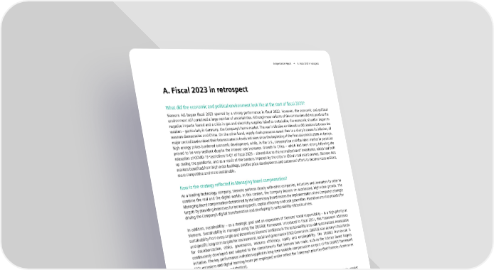 Compensation Report → A. Fiscal 2023 in retrospect A. Fiscal 2023 in retrospect What did the economic and political environment look like at the start of fiscal 2023? Siemens AG began fiscal 2023 spurred by a strong performance in fiscal 2022. However, the economic and political environment still contained a large number of uncertainties. Although new variants of the coronavirus did not produce the negative impacts feared and a crisis in gas and electricity supplies failed to materialize, the economic situation began to weaken – particularly in Germany, the Company’s home market. The war in Ukraine continued as did tensions between the western democracies and China. On the other hand, supply chain pressures eased. Due to a sharp increase in inflation, all major central banks raised their interest rates to levels not seen since the beginning of the financial crisis in 2008. In Europe, high energy prices burdened economic development, while, in the U.S., consumption and the labor market in particular proved to be very resilient despite the interest rate increases. Growth in China – which had been strong following the relaxation of COVID-19 restrictions in Q1 of fiscal 2023 – slowed due to the normalization of inventories, which had built up during the pandemic, and as a result of the burdens imposed by the crisis in China’s real estate market. Siemens AG’s markets benefited from high order backlogs, positive price developments and customers’ efforts to become more resilient, more competitive and more sustainable. How is the strategy reflected in Managing Board compensation? As a leading technology company, Siemens partners closely with other companies, industries and innovators in order to combine the real and the digital worlds. In this context, the Company focuses on accelerated, high-value growth. The Managing Board compensation determined by the Supervisory Board fosters the implementation of the Company’s strategic targets by providing incentives for increasing profit, capital efficiency and cash generation. Incentives are also provided for driving the Company‘s digital transformation and developing its sustainability-related business. In addition, sustainability – as a strategic goal and an expression of Siemens’ social responsibility – is a high priority at Siemens. Sustainability is managed using the DEGREE framework. Introduced in fiscal 2021, this framework addresses sustainability from every angle and determines Siemens’ ambitions in the sustainability area with systematized, measurable and specific long-term targets for environment, social and governance (ESG) dimensions. DEGREE is an acronym that stands for decarbonization, ethics, governance, resource efficiency, equity and employability. The DEGREE framework is continuously developed and adapted to the commitments that Siemens has made, such as the Science Based Targets initiative. The key performance indicators applied in long-term variable compensation are part of this DEGREE framework (CO 2 emissions and digital learning hours per employee) and/or reflect the Company’s priorities (Net Promoter Score as an expression of customer satisfaction). How did Siemens perform in fiscal 2023? Fiscal 2023 was another very successful year for Siemens. We achieved excellent financial results in a volatile market environment, which on the one hand included destocking by customers and distributors following previously proactive purchasing, particularly in our short-cycle businesses, and on the other hand included improved supply chain conditions, which accelerated revenue conversion from our high order backlog. We raised our outlook during the fiscal year after the first and the second quarters. We then reached or exceeded all the targets set for our primary measures for fiscal 2023. Revenue was higher in nearly all our industrial businesses and rose to €77.8 billion, up 8% year-over-year. Smart Infrastructure and Digital Industries contributed double-digit growth with all businesses posting increases. Excluding currency translation and portfolio effects, revenue for Siemens rose 11%. Profit Industrial Business exceeded the record high of a year earlier and rose 11% to €11.4 billion. The profit margin of our Industrial Business rose to 15.4%, up from 15.1% a year earlier, reaching its highest level ever. Net income nearly doubled year-over year to a historic high of €8.5 billion and corresponding basic earnings per share (EPS) more than doubled to €10.04. Earnings per share before purchase price allocation (EPS pre PPA) increased to €10.77. Return on capital employed (ROCE) for fiscal 2023 rose to 18.6%, up from 10.0% in fiscal 2022. This increase was due to sharply higher income before interest after tax year-over-year. We thus exceeded the forecast for ROCE, which was to come close to or reach the lower end of our target range of 15% to 20%. Free cash flow from continuing and discontinued operations for fiscal 2023 was €10.0 billion, reaching a record high. The cash conversion rate for Siemens, defined as the ratio of free cash flow from continuing and discontinued operations to net FISCAL 2023 4