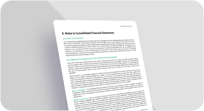 Consolidated Financial Statements 6. Notes to Consolidated Financial Statements NOTE 1 Basis of presentation The accompanying Consolidated Financial Statements present the operations of Siemens Aktiengesellschaft with registered offices in Berlin (registry number HRB 12300) and Munich (registry number HRB 6684), Germany, and its subsidiaries (the Company or Siemens). They have been prepared in accordance with International Financial Reporting Standards (IFRS), as adopted by the European Union as well as with the additional requirements set forth in Section 315e (1) of the German Commercial Code (HGB). The Consolidated Financial Statements are in accordance with IFRS as issued by the International Accounting Standards Board (IASB). The Consolidated Financial Statements were authorized for issue by the Managing Board on December 4, 2023. Siemens prepares and reports its Consolidated Financial Statements in euros (€). Due to rounding, numbers presented may not add up precisely to totals provided. Siemens is a German based multinational focused technology company. NOTE 2 Material accounting policies and critical accounting estimates Certain of the following accounting policies require critical accounting estimates that involve complex and subjective judgments and the use of assumptions, some of which may be for matters that are inherently uncertain and susceptible to change. Such critical accounting estimates could change from period to period and have a material impact on the Company’s results of operations, financial positions and cash flows. Critical accounting estimates could also involve estimates where Siemens reasonably could have used a different estimate in the current accounting period. Siemens cautions that future events often vary from forecasts and that estimates routinely require adjustment. Siemens operates in an increasingly complex and uncertain macroeconomic and geopolitical environment, particularly due to the war in Ukraine and the conflict in Israel-Gaza/Middle East. Notably, we face continuing inflation, increased interest rates, volatile foreign currencies and share prices along with a rising apprehension of a slow-down of economic growth in significant markets compared to prior years. Uncertainties increase in prognosis and forecasts, in applying critical accounting estimates and in using management judgements. Those trends could impact fair values and carrying amounts of assets and liabilities, amount and timing of results of operations and cash flows of Siemens. Severity and duration of those trends are decisive on the magnitude of its impact on Siemens’ Consolidated Financial Statements. Siemens based its estimates and assumptions on existing knowledge and best information available. Basis of consolidation – The Consolidated Financial Statements include the accounts of Siemens AG and its subsidiaries over which the Company has control. Siemens controls an investee if it has power over the investee. In addition, Siemens is exposed to, or has rights to, variable returns from the involvement with the investee and Siemens is able to use its power over the investee to affect the amount of Siemens’ return. Business combinations – Cost of an acquisition is measured at the fair value of the assets given and liabilities incurred or assumed at the date of exchange. Identifiable assets acquired and liabilities assumed in a business combination (including contingent liabilities) are initially measured at their fair values at the acquisition date, irrespective of the extent of any non-controlling interest. Non-controlling interests are measured at the proportional fair value of assets acquired and liabilities assumed (partial goodwill method). If there is no loss of control, transactions with non-controlling interests are accounted for as equity transactions not affecting net income. At the date control is lost, any retained equity interests are remeasured to fair value. In case of a written put option on non-controlling interests the Company assesses whether the prerequisites for the transfer of present ownership interest are fulfilled at the balance sheet date. If the Company is not the beneficial owner of the shares underlying the put option, the exercise of the put option will be assumed at each balance sheet date and treated as equity transaction between shareholders with the recognition of a purchase liability at the respective exercise price. The non-controlling interests participate in profits and losses during the reporting period. Associates and joint ventures – Associates are companies over which Siemens has the ability to exercise significant influence over operating and financial policies (generally through direct or indirect ownership of 20% to 50% of the voting rights). Joint ventures are entities over which Siemens and one or more parties have joint control. Joint control requires unanimous consent of the parties sharing control in decision making on relevant activities. Associates and joint ventures are recorded in the Consolidated Financial Statements using the equity method and are initially recognized at cost. If the investment was retained in a transaction in which Siemens lost control of a subsidiary, the fair value of the investment represents the cost on initial recognition. Siemens’ share of its associate’s or joint venture’s post-acquisition profits or losses is recognized in the Consolidated Statements of Income, and its share of post-acquisition changes in equity that have not been recognized in the associate’s or joint venture’s profit or loss is recognized directly in equity. The cumulative post-acquisition changes also include effects from fair value adjustments and are adjusted against the carrying amount of the investment. When Siemens’ share of losses in an associate or joint venture equals or exceeds its interest in the investment, Siemens does not recognize further losses, unless it incurs obligations or makes paymen