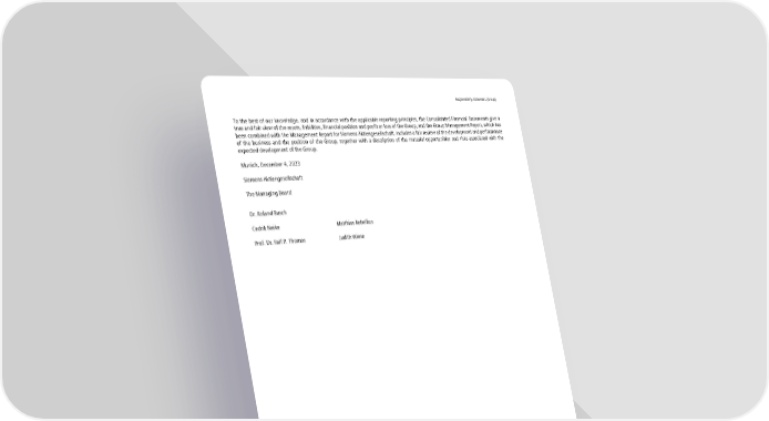 Responsibility Statement (Group) To the best of our knowledge, and in accordance with the applicable reporting principles, the Consolidated Financial Statements give a true and fair view of the assets, liabilities, financial position and profit or loss of the Group, and the Group Management Report, which has been combined with the Management Report for Siemens Aktiengesellschaft, includes a fair review of the development and performance of the business and the position of the Group, together with a description of the material opportunities and risks associated with the expected development of the Group. Munich, December 4, 2023 Siemens Aktiengesellschaft The Managing Board Dr. Roland Busch Cedrik Neike Matthias Rebellius Prof. Dr. Ralf P. Thomas Judith Wiese 2