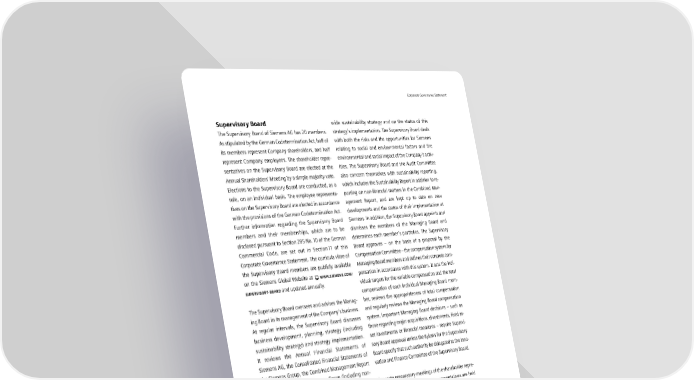 Corporate Governance Statement Supervisory Board wide sustainability strategy and on the status of this The Supervisory Board of Siemens AG has 20 members. strategy’s implementation. The Supervisory Board deals As stipulated by the German Codetermination Act, half of with both the risks and the opportunities for Siemens its members represent Company shareholders, and half relating to social and environmental factors and the represent Company employees. The shareholder repre environmental and social impact of the Company’s activ sentatives on the Supervisory Board are elected at the ities. The Supervisory Board and the Audit Committee Annual Shareholders’ Meeting by a simple majority vote. also concern themselves with sustainability reporting, Elections to the Supervisory Board are conducted, as a which includes the Sustainability Report in addition to re rule, on an individual basis. The employee representa porting on nonfinancial matters in the Combined Man tives on the Supervisory Board are elected in accordance agement Report, and are kept up to date on new with the provisions of the German Codetermination Act. developments and the status of their implementation at Further information regarding the Supervisory Board Siemens. In addition, the Supervisory Board appoints and members and their memberships, which are to be dismisses the members of the Managing Board and disclosed pursuant to Section 285 No. 10 of the German determines each member’s portfolios. The Supervisory Commercial Code, are set out in Section 11 of this Board approves – on the basis of a proposal by the Cor porate Governance Statement. The curricula vitae of Compensation Committee – the compensation system for the Supervisory Board members are publicly available Managing Board members and defines their concrete com on the Siemens Global Website at WWW.SIEMENS.COM/ pensation in accordance with this system. It sets the indi SUPERVISORY-BOARD and updated annually. vidual targets for the variable compensation and the total compensation of each individual Managing Board mem The Supervisory Board oversees and advises the Manag ber, reviews the appropriateness of total compensation ing Board in its management of the Company’s business. and regularly reviews the Managing Board compensation At regular intervals, the Supervisory Board discusses system. Important Managing Board decisions – such as business development, planning, strategy (including those regarding major acquisitions, divestments, fixed as sustainability strategy) and strategy implementation. set investments or financial measures – require Supervi It reviews the Annual Financial Statements of sory Board approval unless the Bylaws for the Super visory Siemens AG, the Consolidated Financial Statements of Board specify that such authority be delegated to the Inno the Siemens Group, the Combined Management Report vation and Finance Committee of the Supervisory Board. of Siemens AG and the Siemens Group (including non financial matters), and the proposal for the appropriation Separate preparatory meetings of the shareholder repre of net income. It approves the Annual Financial State sentatives and of the employee representatives are held ments of Siemens AG as well as the Consolidated Finan regularly in order to prepare the Supervisory Board meet cial Statements of the Siemens Group, based on the ings. The Supervisory Board also meets regularly without results of the preliminary review conducted by the Audit the Managing Board in attendance. Every Supervisory Committee and taking into account the reports of the Board member must disclose conflicts of interest to the independent auditors. The Supervisory Board approves Supervisory Board. Information regarding conflicts of the Managing Board’s proposal for the appropriation of interest that may have arisen and their handling is net income and the Report of the Supervisory Board to provided in the Report of the Supervisory Board. Special the Annual Shareholders’ Meeting. The Supervisory informational (onboarding) events are held in order to Board is jointly responsible with the Managing Board for familiarize new Supervisory Board members with the the preparation of the Compensation Report. In addition, Company’s business model and the structures of the the Company’s adherence to statutory provisions, official Siemens Group. The Supervisory Board members take regulations and internal Company policies (compliance) part, on their own responsibility, in the educational and are monitored by the Supervisory Board and / or the Audit training measures necessary for the performance of their Committee. The Supervisory Board’s oversight and duties – measures relating, for example, to changes in advisory activities also encompass, in particular, sustain the legal framework and new, groundbreaking tech abilityrelated topics in the environment, social and nologies. The Company supports them in this regard. governance (ESG) area. The Managing Board reports Internal informational events are offered when necessary regularly to the Supervisory Board on Siemens’ Company to support targeted training measures. 5