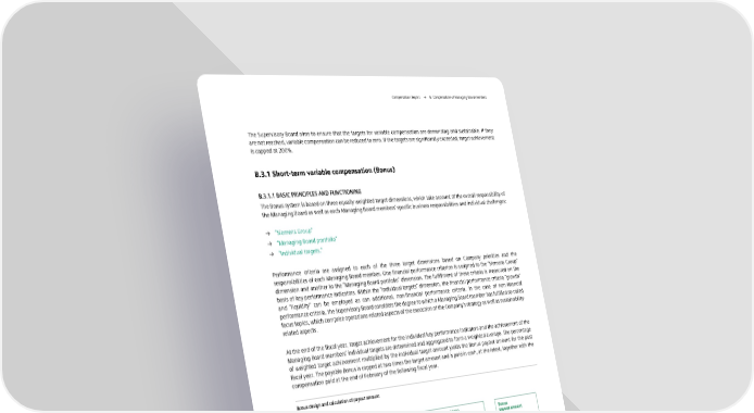 Compensation Report → B. Compensation of Managing Board members The Supervisory Board aims to ensure that the targets for variable compensation are demanding and sustainable. If they are not reached, variable compensation can be reduced to zero. If the targets are significantly exceeded, target achievement is capped at 200%. B.3.1 Short-term variable compensation (Bonus) B.3.1.1 BASIC PRINCIPLES AND FUNCTIONING The Bonus system is based on three equally weighted target dimensions, which take account of the overall responsibility of the Managing Board as well as each Managing Board members’ specific business responsibilities and individual challenges: → “Siemens Group” → “Managing Board portfolio” → “Individual targets.” Performance criteria are assigned to each of the three target dimensions based on Company priorities and the responsibilities of each Managing Board member. One financial performance criterion is assigned to the “Siemens Group” dimension and another to the “Managing Board portfolio” dimension. The fulfillment of these criteria is measured on the basis of key performance indicators. Within the “Individual targets” dimension, the financial performance criteria “growth” and “liquidity” can be employed as can additional, non-financial performance criteria. In the case of non-financial performance criteria, the Supervisory Board considers the degree to which a Managing Board member has fulfilled so-called focus topics, which comprise operations-related aspects of the execution of the Company’s strategy as well as sustainability- related aspects. At the end of the fiscal year, target achievement for the individual key performance indicators and the achievement of the Managing Board members’ individual targets are determined and aggregated to form a weighted average. The percentage of weighted target achievement multiplied by the individual target amount yields the Bonus payout amount for the past fiscal year. The payable Bonus is capped at two times the target amount and is paid in cash, at the latest, together with the compensation paid at the end of February of the following fiscal year. Bonus design and calculation of payout amount Bonus Weighted average target achievement (0%-200%) Bonus target amount payout amount 33.34% 33.33% 33.33% Siemens Managing Individual Group Board targets portfolio B.3.1.2. BONUS FOR FISCAL 2023 “Siemens Group” target dimension For the “Siemens Group” target dimension in fiscal 2023, the Supervisory Board of Siemens AG defined the performance criterion “profit.” In accordance with external communications and the Siemens Financial Framework for the financial steering of the Company, the focus is on the transparent presentation of Siemens’ operating performance. For this reason, “profit” is measured in terms of basic earnings per share before purchase price allocation (EPS pre PPA). EPS pre PPA is defined as basic earnings per share from net income adjusted for amortization of intangible assets acquired in business combinations and related income taxes. It includes the amounts attributable to shareholders of Siemens AG. To take account of the Company’s long-term performance and provide incentives for a sustainable increase in profit, the average EPS pre PPA of three consecutive fiscal years was used for target setting. The portfolio of Siemens AG changed significantly due to the spin-off of Siemens Energy at the end of fiscal 2020. Against this backdrop, target setting for fiscal 2023 was defined on the basis of comparable EPS pre PPA values. The following EPS pre PPA values were used for this purpose: the EPS pre PPA value of continuing operations was used for fiscal 2020, and the EPS pre PPA values of continuing and discontinued operations were used for fiscal 2021 and fiscal 2022. FISCAL 2023 14