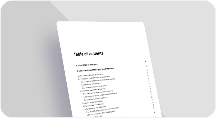 Table of contents A. Fiscal 2023 in retrospect 4 B. Compensation of Managing Board members 6 B.1 The compensation system at a glance 6 B.2 Principles of the determination of compensation 10 B.2.1 Target compensation and compensation structure 10 B.2.2 Maximum compensation 12 B.2.3 Appropriateness of compensation 12 B.3 Variable compensation in fiscal 2023 13 B.3.1 Short-term variable compensation (Bonus) 14 B.3.2 Long-term variable compensation (Stock Awards) 19 B.3.3 Malus and clawback regulations 25 B.4 Share Ownership Guidelines 26 B.5 Pension benefit commitment 26 B.6 Compensation awarded and due 27 B.6.1 Active Managing Board members in fiscal 2023 27 B.6.2 Former members of the Managing Board 30 B.7 Outlook for fiscal 2024 31 C. Compensation of Supervisory Board members 32 D. Comparative information on profit development and annual change in compensation 34 E. Other 37 Independent auditor’s report 38