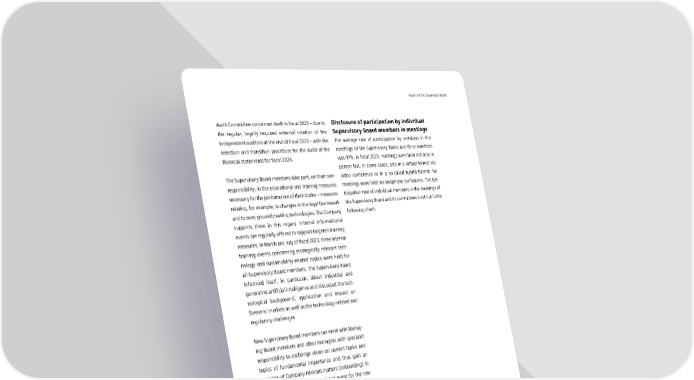 Report of the Supervisory Board Audit Committee concerned itself in fiscal 2023 – due to Disclosure of participation by individual the regular, legally required external rotation of the Supervisory Board members in meetings independent auditors at the end of fiscal 2023 – with the The average rate of participation by members in the selection and transition procedure for the audit of the meetings of the Supervisory Board and its committees financial statements for fiscal 2024. was 97 %. In fiscal 2023, meetings were held not only in person but, in some cases, also in a virtual format via The Supervisory Board members take part, on their own video conference or in a so-called hybrid format. No responsibility, in the educational and training measures meetings were held via telephone conference. The par- necessary for the performance of their duties – measures ticipation rate of individual members in the meetings of relating, for example, to changes in the legal framework the Supervisory Board and its committees is set out in the and to new, groundbreaking technologies. The Company following chart: supports them in this regard. Internal informational events are regularly offered to support targeted training measures. In March and July of fiscal 2023, three internal training events concerning strategically relevant tech- nology and sustainability-related topics were held for all Supervisory Board members. The Supervisory Board informed itself, in particular, about industrial and generative artificial intelligence and discussed the tech- nological background, application and impact on Siemens’ markets as well as the technology-related and regulatory challenges. New Supervisory Board members can meet with Manag- ing Board members and other managers with specialist responsibility to exchange views on current topics and topics of fundamental importance and thus gain an overview of Company-relevant matters (onboarding). In fiscal 2023, a separate informational event for the new members of the Supervisory Board was held on March 13, 2023, to familiarize those members, in particular, with the Company’s business model and strategy and with the structures of the Siemens Group. As part of this onboard- ing program, Supervisory Board members also have the opportunity to visit the various locations of different Siemens business areas and gain an insight into the port- folio as well as production and manufacturing methods. Longer-serving Supervisory Board members may also attend onboarding events and regularly do so. FISCAL 2023 7