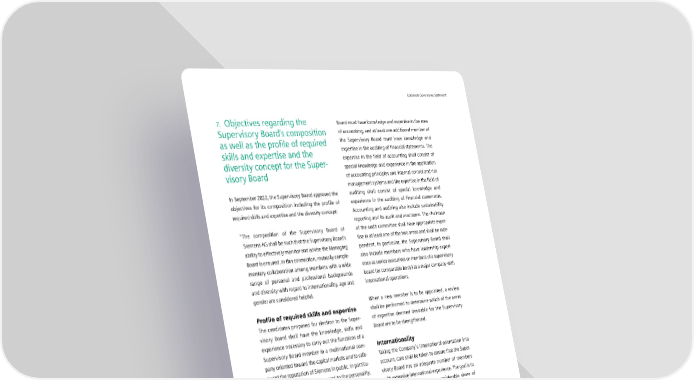 Corporate Governance Statement 7. Objectives regarding the Board must have knowledge and expertise in the area Supervisory Board’s composition of accounting, and at least one additional member of as well as the profile of required the Supervisory Board must have knowledge and skills and expertise and the expertise in the auditing of financial statements. The diversity concept for the Super expertise in the field of accounting shall consist of special knowledge and experience in the application visory Board of accounting principles and internal control and risk management systems and the expertise in the field of In September 2022, the Supervisory Board approved the auditing shall consist of special knowledge and objectives for its composition including the profile of experience in the auditing of financial statements. required skills and expertise and the diversity concept: Accounting and auditing also include sustainability reporting and its audit and assurance. The chairman “ The composition of the Supervisory Board of of the audit committee shall have appropriate exper Siemens AG shall be such that the Supervisory Board’s tise in at least one of the two areas and shall be inde ability to effectively monitor and advise the Managing pendent. In particular, the Supervisory Board shall Board is ensured. In this connection, mutually comple also include members who have leadership experi mentary collaboration among members with a wide ence as senior executives or members of a supervisory range of personal and professional backgrounds board (or comparable body) at a major company with and diversity with regard to internationality, age and international operations. gender are considered helpful. When a new member is to be appointed, a review Profile of required skills and expertise shall be performed to determine which of the areas The candidates proposed for election to the Super of expertise deemed desirable for the Supervisory visory Board shall have the knowledge, skills and Board are to be strengthened. experience necessary to carry out the functions of a Supervisory Board member in a multinational com Internationality pany oriented toward the capital markets and to safe Taking the Company’s international orientation into guard the reputation of Siemens in public. In particu account, care shall be taken to ensure that the Super lar, care shall be taken with regard to the personality, visory Board has an adequate number of members integrity, commitment and professionalism of the with extensive international experience. The goal is to individuals proposed for election. make sure that the present considerable share of Supervisory Board members with extensive inter The goal is to ensure that, in the Supervisory Board, as national experience is maintained. a group, all the knowhow and experience is available that is considered essential in view of Siemens’ acti Diversity vities. This includes, for instance, knowledge and With regard to the composition of the Supervisory experience in the areas of technology (including infor Board, attention shall be paid to achieving sufficient mation technology, digitalization and cybersecurity), diversity. Not only is appropriate consideration to be sustainability, transformation, procurement, manu given to women. Diversity of cultural heritage and a facturing, research and development, sales, finance, wide range of educational and professional back risk management, law (including compliance) and grounds, experiences and ways of thinking are also to human resources. In addition, the members of the be promoted. When considering possible candidates Supervisory Board shall collectively have knowledge for new elections or for filling Supervisory Board and experience in the business areas that are impor positions that have become vacant, the Supervisory tant for Siemens, in particular, in the areas of industry, Board shall give appropriate consideration to diversity infrastructure, energy, mobility and healthcare. As a at an early stage in the selection process. group, the members of the Supervisory Board are to be familiar with the sector in which the Company In accordance with the German Stock Corporation operates. In accordance with the German Stock Cor Act, the Supervisory Board is composed of at least poration Act, at least one member of the Supervisory 30 % women and at least 30 % men. The Nominating 11