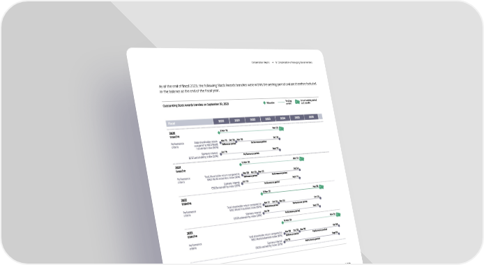 Compensation Report → B. Compensation of Managing Board members As of the end of fiscal 2023, the following Stock Awards tranches were within the vesting period and are therefore included in the balance at the end of the fiscal year. Outstanding Stock Awards tranches on September 30, 2023 Allocation Vesting End of vesting period period and transfer Fiscal 2020 2021 2022 2023 2024 2025 2026 2020 tranche Performance Total shareholder return Nov '19 Oct '20 Nov '20 criteria compared to MSCI World Reference periocr Industrials index (80%) Siemens-internal , Oct'19 ESG/Sustainability index (20%) 2021 13 Nov '20 tranche Performance Total shareholder return compared to ( Nov '20 Oct '21 Nov '21 criteria MSCI World Industrials index (80%) ’ Reference period Performance period Siemens-internal t Oct '20 ESG/Sustainability index (20%) 2022 12 Nov '21 Nov '25 tranche , Nov '21 Oct '22 Nov '22 Oct '25 Performance Total shareholder return compared to criteria MSCI World Industrials index (80%) Performance period ) Reference period’ Siemens-internal Oct '21 Sept '25 ESG/Sustainability index (20%) Performance period 2023 18 Nov '22 tranche Performance Total shareholder return compared to Nov '22 Oct '23 Nov '23 Oct '26 criteria MSCI World Industrials index (80%) W Reference period W Performance period Siemens-internal g Oct '22 Sept '26 ESG/Sustainability index (20%) * Performance period B.3.3 Malus and clawback regulations Under existing malus and clawback regulations, the Supervisory Board is authorized to withhold or reclaim variable compensation in cases of severe breaches of duty or compliance and/or unethical behavior or in cases of grossly negligent or willful breaches of the duty of care or in cases in which variable compensation components linked to the achievement of specific targets have been unduly paid out on the basis of incorrect data. The Supervisory Board exercises its authority to withhold or reclaim variable compensation components at its duty-bound discretion. In fiscal 2023, the Supervisory Board did not exercise this authority. FISCAL 2023 25