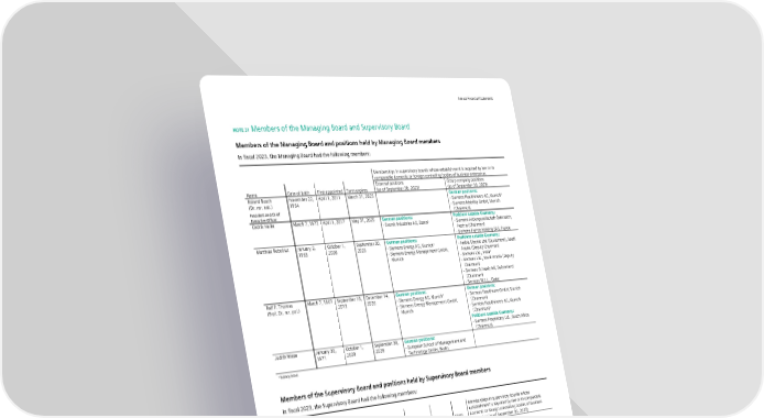 Annual Financial Statements NOTE 31 Members of the Managing Board and Supervisory Board Members of the Managing Board and positions held by Managing Board members In fiscal 2023, the Managing Board had the following members: Memberships in supervisory boards whose establishment is required by law or in comparable domestic or foreign controlling bodies of business enterprises External positions Group company positions Name Date of birth First appointed Term expires (as of September 30, 2023) (as of September 30, 2023) Roland Busch November 22, April 1, 2011 March 31, 2025 German positions: (Dr. rer. nat.) 1964 - Siemens Healthineers AG, Munich¹ President and Chief - Siemens Mobility GmbH, Munich Executive Officer (Chairman) Cedrik Neike March 7, 1973 April 1, 2017 May 31, 2025 German positions: Positions outside Germany: - Evonik Industries AG, Essen¹ - Siemens Aktiengesellschaft Österreich, Austria (Chairman) - Siemens France Holding SAS, France Matthias Rebellius January 2, October 1, September 30, German positions: Positions outside Germany: 1965 2020 2025 - Siemens Energy AG, Munich¹ - Arabia Electric Ltd. (Equipment), Saudi - Siemens Energy Management GmbH, Arabia (Deputy Chairman) Munich - Siemens Ltd., India¹ - Siemens Ltd., Saudi Arabia (Deputy Chairman) - Siemens Schweiz AG, Switzerland (Chairman) - Siemens W.L.L., Qatar Ralf P. Thomas March 7, 1961 September 18, December 14, German positions: German positions: (Prof. Dr. rer. pol.) 2013 2026 - Siemens Energy AG, Munich¹ - Siemens Healthcare GmbH, Munich - Siemens Energy Management GmbH, (Chairman) Munich - Siemens Healthineers AG, Munich (Chairman)¹ Positions outside Germany: - Siemens Proprietary Ltd., South Africa (Chairman) Judith Wiese January 30, October 1, September 30, German positions: 1971 2020 2028 - European School of Management and Technology GmbH, Berlin 1 Publicly listed. Members of the Supervisory Board and positions held by Supervisory Board members In fiscal 2023, the Supervisory Board had the following members: Memberships in supervisory boards whose establishment is required by law or in comparable Member Term domestic or foreign controlling bodies of business Name Occupation Date of birth since expires1 enterprises (as of September 30, 2023) Jim Hagemann Snabe Chairman of the Supervisory Board of October 27, October 1, 2025 Positions outside Germany: Chairman Siemens AG 1965 2013 - C3.ai, Inc., USA3 - Northvolt AB, Sweden (Chairman) - Urban Partners A/S, Denmark (Deputy Chairman) Birgit Steinborn2 Chairwoman of the Central Works Council March 26, January 24, 2028 First Deputy Chairwoman of Siemens AG 1960 2008 Werner Brandt Chairman of the Supervisory Board of January 3, January 31, 2027 German positions: 3 (Dr. rer. pol.) RWE AG 1954 2018 - RWE AG, Essen (Chairman) Second Deputy Chairman Tobias Bäumler2 Deputy Chairman of the Central Works October 10, October 2028 Council and of the Combine Works 1979 16, 2020 Council of Siemens AG Michael Diekmann Chairman of the Supervisory Board of December 23, January 24, 2023 German positions: 3 (until February 9, 2023) Allianz SE 1954 2008 - Allianz SE, Munich (Chairman) (as of February 9, 2023) - Fresenius Management SE, Bad Homburg - Fresenius SE & Co. KGaA, Bad Homburg (Deputy 3 Chairman) Regina E. Dugan President and Chief Executive Officer of March 19, February 9, 2027 Positions outside Germany: 3 (PhD) Wellcome Leap Inc. 1963 2023 - HPE, Houston, Texas, USA (since February 9, 2023) Andrea Fehrmann2 Trade Union Secretary, IG Metall Regional June 21, January 31, 2028 German positions: (Dr. phil.) Office for Bavaria 1970 2018 - Airbus Defence and Space GmbH, Taufkirchen 3 - Siemens Energy AG, Munich - Siemens Energy Management GmbH, Munich Bettina Haller2 Chairwoman of the Combine Works March 14, April 1, 2028 German positions: Council of Siemens AG 1959 2007 - Siemens Mobility GmbH, Munich (Deputy Chairwoman) 18