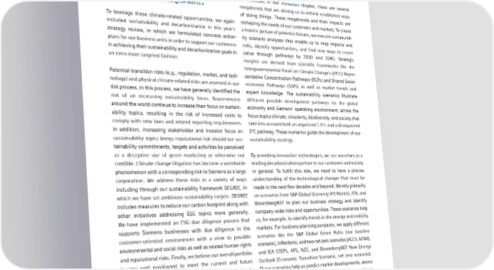 7.4 Task Force on ClimateRelated Financial Disclosures (TCFD) low-carbon economy. Siemens also welcomes and supports and risks. Our decarbonization target, which is approved by recent legislative and governmental measures to accelerate the Science-Based Targets initiative, is aligned with the 1.5°C the mitigation of climate change, especially in Europe such target and therefore the Paris Agreement. as through the Green Deal or sustainable finance initiatives. SIEMENS FINANCIAL REPORT FOR FISCAL 2023, COMBINED MANAGEMENT As described in our STRATEGY chapter, there are several REPORT, CHAPTER 8.4 OPPORTUNITIES, CDP 2023 C2.4 megatrends that are driving us to rethink established ways of doing things. These megatrends and their impacts are To leverage these climate-related opportunities, we again reshaping the needs of our customers and markets. To create included sustainability and decarbonization in this year’s a holistic picture of potential futures, we execute sustainabil- strategy review, in which we formulated concrete action ity scenario analyses that enable us to map impacts and plans for our business units in order to support our customers risks, identify opportunities, and find new ways to create in achieving their sustainability and decarbonization goals in value through pathways by 2030 and 2040. Strategic an even more targeted fashion. insights are derived from scientific frameworks like the Intergovernmental Panel on Climate Change’s (IPCC) Repre- Potential transition risks (e.g., regulation, market, and tech- sentative Concentration Pathways (RCPs) and Shared Socio- nology) and physical climate-related risks are assessed in our economic Pathways (SSPs) as well as market trends and risk process. In this process, we have generally identified the expert knowledge. The sustainability scenarios illustrate risk of an increasing sustainability focus. Governments different possible development pathways for the global around the world continue to increase their focus on sustain- economy and Siemens’ operating environment, across the ability topics, resulting in the risk of increased costs to focus topics climate, circularity, biodiversity, and society that comply with new laws and related reporting requirements. take into account both an organized 1.5°C and a disorganized In addition, increasing stakeholder and investor focus on 3°C pathway. These scenarios guide the development of our sustainability topics brings reputational risk should our sus- sustainability strategy. tainability commitments, targets and activities be perceived as a deceptive use of green marketing or otherwise not By providing innovative technologies, we see ourselves as a credible. Climate change litigation has become a worldwide leading decarbonization partner to our customers and society phenomenon with a corresponding risk to Siemens as a large in general. To fulfill this role, we need to have a precise corporation. We address these risks in a variety of ways understanding of the technological changes that must be including through our sustainability framework DEGREE, in made in the next few decades and beyond. We rely primarily which we have set ambitious sustainability targets. DEGREE on scenarios from S&P Global (formerly IHS Markit), IEA, and includes measures to reduce our carbon footprint along with BloombergNEF to plan our business strategy and identify other initiatives addressing ESG topics more generally. company-wide risks and opportunities. These scenarios help We have implemented an ESG due diligence process that us, for example, to identify trends in the energy and mobility supports Siemens businesses with due diligence in the markets. For business planning purposes, we apply different customer- oriented environment with a view to possible scenarios like the S&P Global Green Rules (our baseline environmental and social risks as well as related human rights scenario), Inflections, and two net zero scenarios (ACCS, MTM); and reputational risks. Finally, we believe our overall portfolio and IEA STEPS, APS, NZE, and BloombergNEF New Energy is very well positioned to meet the current and future Outlook (Economic Transition Scenario, net zero scenario). sustainability needs of our customers and the societies in These scenarios help us predict market developments, assess which we operate. the implications of various scenarios, and make business SIEMENS FINANCIAL REPORT FOR FISCAL 2023, COMBINED MANAGEMENT decisions on this basis. With a view to our own business, REPORT, CHAPTER 8.3 RISKS, CDP 2023 C2.3 analyzing climate-related scenarios allows us to predict the potential consequences in terms of regulatory requirements, Analysis of climaterelated scenarios R&D, and customer trends and requirements. Our business Different climate-related scenarios are used at Siemens for units also conduct business-specific scenario analyses. different purposes: for instance, for our business strategy CDP 2023 C3.2 and decarbonization strategy and to identify opportunities SIEMENS SUSTAINABILITY REPORT 2023 139