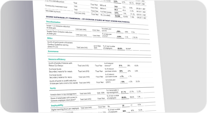 6 Our sustainability indicators Sustainability Key Performance Indicators Fiscal Year/ (KPIs) September 30th Unit FY 2023 FY 2022 +/– Standards Corporate Citizenship Donations Total Fiscal Year Million € 29.2 32.1 −9.0% GRI 201-1, WEF Total Fiscal Year % of Net Income 0.3% 0.7% −53.1% GRI 201-1, WEF Sponsoring Social programs (e.g. Arts and education) Total Fiscal Year Million € 14.0 13.5 3.5% GRI 201-1, WEF Community investment total Total Fiscal Year Million € 43.2 45.6 −5.3% GRI 201-1, WEF Total Fiscal Year % of Net Income 0.5% 1.0% −51.2% GRI 201-1, WEF Volunteering hours Total (w/o SHS) Fiscal Year No. (rounded) 36,500 32,650 11.8% GRI 201-1, WEF DEGREE SUSTAINABILITY FRAMEWORK – KPI OVERVIEW (FIGURES WITHOUT SIEMENS HEALTHINEERS) Decarbonization Scope 1+2: Emission reduction % to base year to base year Total (w/o SHS) Fiscal Year (2019) −50% −46% 9.5% Supply Chain: Emission reduction % to base year to base year Total (w/o SHS) Fiscal Year (2020)43 −0.9% 2.5% −134.0% Ethics Quota of participants of Business Conduct Guideline training up to Sept. % of total number (since FY 23) Total (w/o SHS) 30th of employees 69.0% 99.9%44 Governance Resource efficiency Quota of product families with % of relevant 45 51% 35% 43.0% Robust Eco Design Total (w/o SHS) Fiscal Year revenue Purchase Quota – % of relevant Secondary material for metals Total (w/o SHS) Fiscal Year purchase volume 35% 34% 3.0% Purchase Quota – % of relevant Secondary material for resins Total (w/o SHS) Fiscal Year purchase volume < 1% < 1% Quota of waste-to-landfill reduction % to base year to base year (w/o construction waste) Total (w/o SHS) Fiscal Year (2021) −15% −12% 20.2% Equity % of employees in Female share in top management Total (w/o SHS) Sept. 30th top management 31.1% 27.7% 12.3% Share of employees with access to % of total number Siemens employee share plans46 Total (w/o SHS) Fiscal Year of employees 99.9% 98.6% 1.3% Employability Digital learning hours per employee Total (w/o SHS) Fiscal Year No. 23 21 9.5% Level of access to Employee % of total number 42 Total (w/o SHS) Sept. 30th of employees 96% 87% 10.3% Assistance Program Improvement in global LTIFR47 % to base year to base year Total (w/o SHS) Fiscal Year (2020) −26% −19% 36.8% 42 Scope of HM Reporting: Countries >30 employees as well as affiliated companies >30 employees. 43 Base year 2020 is calculated w/o individual supplier emission data. 44 Year-to-year comparison between fiscal 2022 and fiscal 2023 is limited. The current cycle started in fiscal 2023. 45 In FY 23 the share of relevant revenue was 65% of total revenue Siemens w/o SHS. 46 Where legally possible and reasonable. 47 Number of Lost Time Cases (LTC) x 200,000 / working hours. LTC are accidents that results in at least one lost working day. SIEMENS SUSTAINABILITY REPORT 2023 123