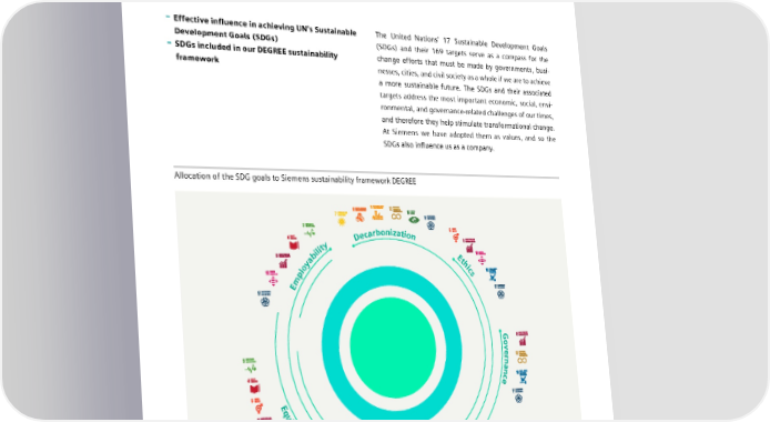 7.3 Our contribution to sustainable development of societies 7.3 Our contribution to sustainable development of societies – Effective influence in achieving UN’s Sustainable The United Nations’ 17 Sustainable Development Goals Development Goals (SDGs) (SDGs) and their 169 targets serve as a compass for the – SDGs included in our DEGREE sustainability change efforts that must be made by governments, busi- framework nesses, cities, and civil society as a whole if we are to achieve a more sustainable future. The SDGs and their associated targets address the most important economic, social, envi- ronmental, and governance-related challenges of our times, and therefore they help stimulate transformational change. At Siemens we have adopted them as values, and so the SDGs also influence us as a company. Allocation of the SDG goals to Siemens sustainability framework DEGREE n o i b za ar t i c on De y t i l i E b t a h y ic o l s mp E Go rev nan ec E q u i t y y c n e i c R f e e s o e c r u SIEMENS SUSTAINABILITY REPORT 2023 132