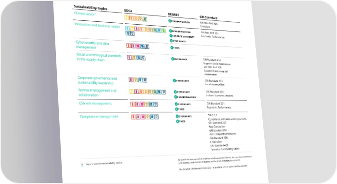 7.5 GRI Standards – key topics and boundaries 7.5 GRI Standards – key topics and boundaries Sustainability topics SDGs DEGREE GRI Standard Climate action1 D ECARBONIZATION GRI Standard 305 Emissions Innovation and business model D ECARBONIZATION GRI Standard 201 R ESOURCE EFFICIENCY Economic Performance G OVERNANCE Cybersecurity and data E THICS management Social and ecological standards G OVERNANCE GRI Standard 414 in the supply chain Supplier Social Assessment GRI Standard 308 Supplier Environmental Assessment Corporate governance and G OVERNANCE GRI Standard 413 sustainability leadership Local communities Partner management and G OVERNANCE GRI Standard 203 collaboration D ECARBONIZATION Indirect Economic Impacts ESG risk management G OVERNANCE GRI Standard 201 E THICS Economic Performance Compliance management G OVERNANCE GRI 2-27 E THICS Compliance with laws and regulations GRI Standard 205 Anti-Corruption GRI Standard 206 Anti-Competitive Behavior GRI Standard 408 Child Labor GRI Standard 409 Forced or Compulsory Labor 1 Top 2 material sustainability topics. Result of the assessment of organizational impacts (inside-out, i.e., on the environment and society), stakeholder relevance and business criticality (outside-in). The detailed GRI Standard Index 2021 is available on our Sustainability website. SIEMENS SUSTAINABILITY REPORT 2023 144