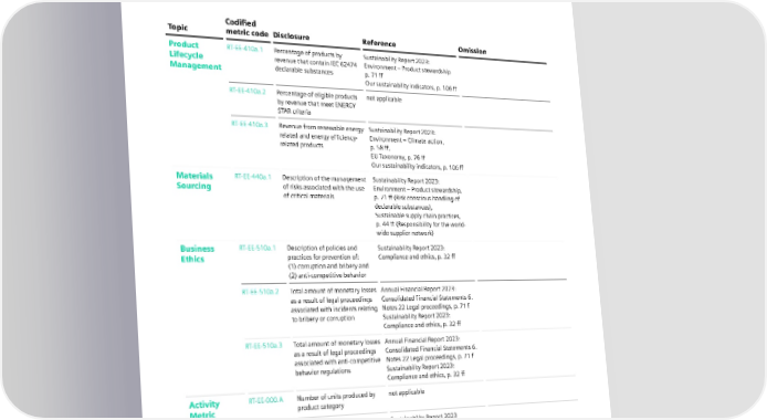 7.7 SASB – Electrical Electronic Equipment Index Codified Topic metric code Disclosure Reference Omission Product RT-EE-410a.1 Percentage of products by Sustainability Report 2023: Lifecycle revenue that contain IEC 62474 Environment – Product stewardship Management declarable substances p. 71 ff Our sustainability indicators, p. 106 ff RT-EE-410a.2 Percentage of eligible products not applicable by revenue that meet ENERGY STAR criteria RT-EE-410a.3 Revenue from renewable energy- Sustainability Report 2023: related and energy efficiency- Environment – Climate action, related products p. 58 ff, EU Taxonomy, p. 76 ff Our sustainability indicators, p. 106 ff Materials RT-EE-440a.1 Description of the management Sustainability Report 2023: Sourcing of risks associated with the use Environment – Product stewardship, of critical materials p. 71 ff (Risk-conscious handling of declarable substances), Sustainable supply chain practices, p. 44 ff (Responsibility for the world- wide supplier network) Business RT-EE-510a.1 Description of policies and Sustainability Report 2023: Ethics practices for prevention of: Compliance and ethics, p. 32 ff (1) corruption and bribery and (2) anti-competitive behavior RT-EE-510a.2 Total amount of monetary losses Annual Financial Report 2023: as a result of legal proceedings Consolidated Financial Statements 6. associated with incidents relating Notes 22 Legal proceedings, p. 71 f to bribery or corruption Sustainability Report 2023: Compliance and ethics, p. 32 ff RT-EE-510a.3 Total amount of monetary losses Annual Financial Report 2023: as a result of legal proceedings Consolidated Financial Statements 6. associated with anti-competitive Notes 22 Legal proceedings, p. 71 f behavior regulations Sustainability Report 2023: Compliance and ethics, p. 32 ff Activity RT-EE-000.A Number of units produced by not applicable Metric product category RT-EE-000.B Number of employees Sustainability Report 2023 Working at Siemens p. 82 ff Our sustainability indicators, p. 106 ff SIEMENS SUSTAINABILITY REPORT 2023 151