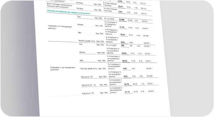 6 Our sustainability indicators Sustainability Key Performance Indicators Fiscal Year/ (KPIs) September 30th Unit FY 2023 FY 2022 +/– Standards Full-/part-time employees in headcount Full-/part-time n/a Sept. 30th No. (rounded) 900 1,600 −43.8% GRI 2-7 Employees covered by collective % of total employees bargaining agreements Germany Sept. 30th in Germany 78.6% 78.3% 0.4% GRI 2-30 Additional employees covered by % of total employees collective agreements23 Germany Sept. 30th in Germany 19.2% 19.5% –1.5% GRI 2-30 Senior managers represented by % of total employees “Executive staff committee” Germany Sept. 30th in Germany 2.2% 2.2% 0.0% GRI 2-30 Diversity of employees per category and function24 Total Sept. 30th No. (rounded) 32,900 30,900 6.5% GRI 405-1 % of employees in all management Women Sept. 30th positions 21.6% 20.6% 4.9% GRI 405-1 Employees in all management % of employees in 25 positions all management Men Sept. 30th positions 78.4% 79.4% –1.3% GRI 405-1 % of employees in all management No/other gender entry Sept. 30th positions 0.0% 0.0% GRI 405-1 Total Sept. 30th No. (rounded) 500 500 0.0% GRI 405-1 % of employees in top management Women Sept. 30th positions 30.8% 27.2% 13.2% GRI 405-1 % of employees in top management Men Sept. 30th positions 69.2% 72.8% –4.9% GRI 405-1 % of employees in Employees in top management top management positions26 No/other gender entry Sept. 30th positions 0.0% 0.0% GRI 405-1 % of employees in top management Age group < 30 Sept. 30th positions 0.2% 0.2% 0.0% GRI 405-1 % of employees in top management Age group 30 – 50 Sept. 30th positions 42.7% 46.0% –7.2% GRI 405-1 % of employees in top management Age group > 50 Sept. 30th positions 57.1% 53.7% 6.3% GRI 405-1 23 Employees not covered by collective bargaining agreements, but the organization determines their working conditions and terms of employment based on collective bargaining agreements that cover its other employees or similar agreements. 24 Diversity data only for employees, without other internal workforce and without external/third party workers. 25 Employees in all management positions with disciplinary responsibility, but without Managing Board Members. 26 Employees in top management positions with disciplinary responsibility, but without Managing Board Members. SIEMENS SUSTAINABILITY REPORT 2023 117