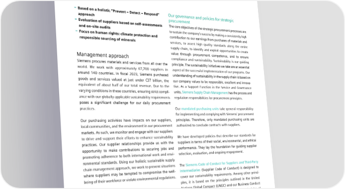 3.3 Sustainable supply chain practices 3.3 Sustainable supply chain practices – Based on a holistic “Prevent – Detect – Respond” Our governance and policies for strategic approach procurement – Evaluation of suppliers based on selfassessments The core objectives of the strategic procurement processes are and onsite audits to sustain the company’s success by making a consistently high – Focus on human rights: climate protection and contribution to our earnings from purchases of materials and responsible sourcing of minerals services, to assert high quality standards along the entire supply chain, to identify and exploit opportunities to create value through procurement competence, and to ensure Management approach compliance and sustainability. Sustainability is our guiding Siemens procures materials and services from all over the principle. The sustainability initiatives we take are an essential world. We work with approximately 67,700 suppliers in aspect of the successful implementation of our programs. Our around 140 countries. In fiscal 2023, Siemens purchased understanding of sustainability in the supply chain is based on goods and services valued at just under €37 billion, the our company values to be responsible, excellent and innova- equivalent of about half of our total revenue. Due to the tive. As a Support Function in the Service and Governance varying conditions in these countries, ensuring strict compli- units, Siemens Supply Chain Management has the process and ance with our globally applicable sustainability requirements regulation responsibilities for procurement principles. poses a significant challenge for our daily procurement practices. Our mandated purchasing units take general responsibility for implementing and complying with Siemens’ procurement Our purchasing activities have impacts on our suppliers, principles. Therefore, only mandated purchasing units are local communities, and the environment in our procurement authorized to conclude contracts with suppliers. markets. As such, we monitor and engage with our suppliers to drive and support their efforts to enhance sustainability We have developed policies that describe our standards for practices. Our supplier relationships provide us with the suppliers in terms of their social, environmental, and ethical opportunity to make contributions to securing jobs and performance. They lay the foundation for guiding supplier promoting adherence to both international work and envi- selection, evaluation, and ongoing engagement. ronmental standards. Using our holistic sustainable supply chain management approach, we work to prevent situations The Siemens Code of Conduct for Suppliers and Third-Party where suppliers may be tempted to compromise the well- Intermediaries (Supplier Code of Conduct) is designed to being of their workforce or violate environmental regulations. - cover our sustainability requirements. Among other princi ples, it is based on the principles outlined in the United Nations Global Compact (UNGC) and our Business Conduct Guidelines (BCGs), which sets out the basic principles of sustainability for our suppliers. Siemens purchased goods and services worth €37 billion from The Supplier Code of Conduct requires suppliers to adhere to about 140 countries standards on: → Fundamental rights of employees, including a protected grievance mechanism for employees → Health, safety, and environmental protection SIEMENS SUSTAINABILITY REPORT 2023 44